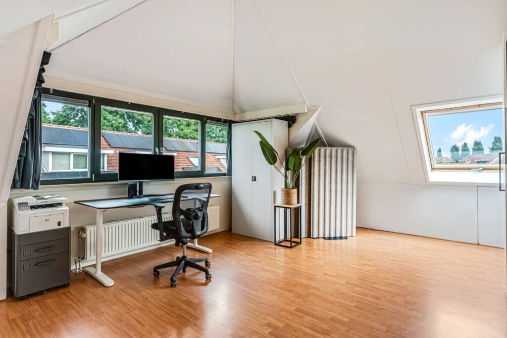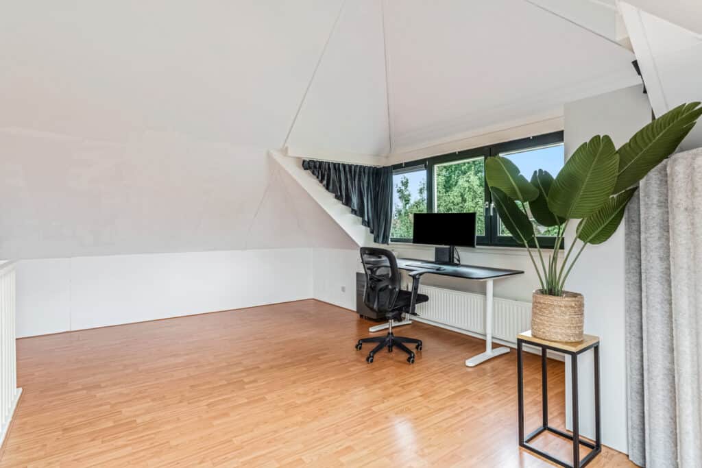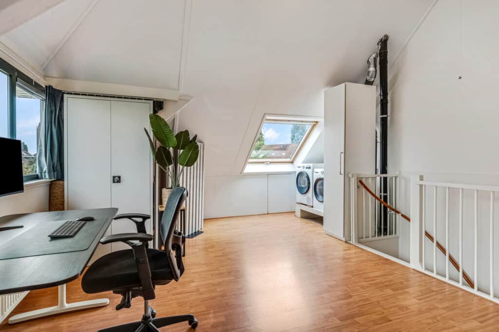 De vaste trap leidt naar de tweede verdieping, een volwaardige en multifunctionele ruimte. Dankzij de brede dakkapel aan de zijkant en het grote dakraam aan de achterzijde is deze verdieping heerlijk licht. De open ruimte is afgewerkt met laminaat, beschikt over knieschotten voor extra bergruimte en heeft een aparte washoek. Of je deze verdieping gebruikt als extra slaapkamer, werkruimte of hobbykamer – de mogelijkheden zijn volop aanwezig. Zelfs voor nog een extra (slaap)kamer.