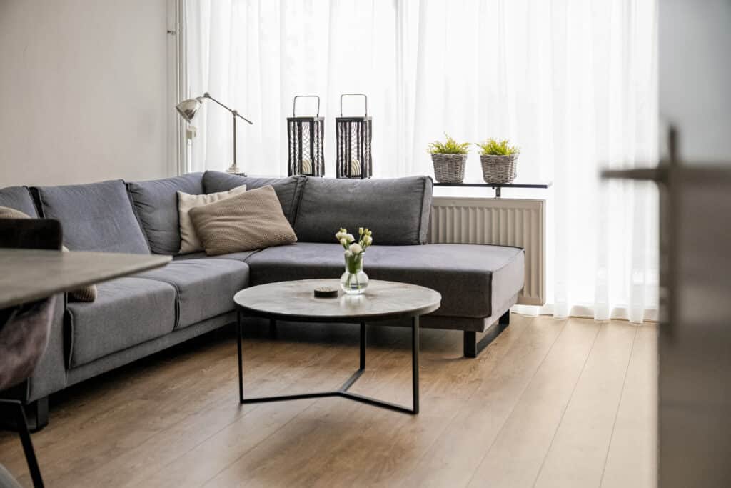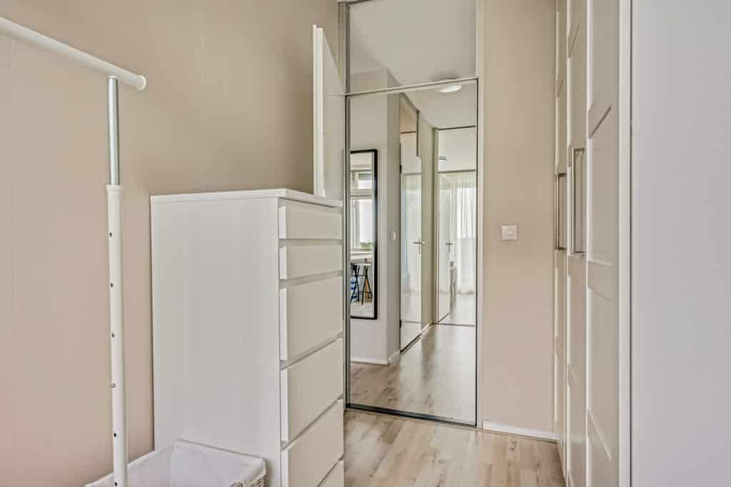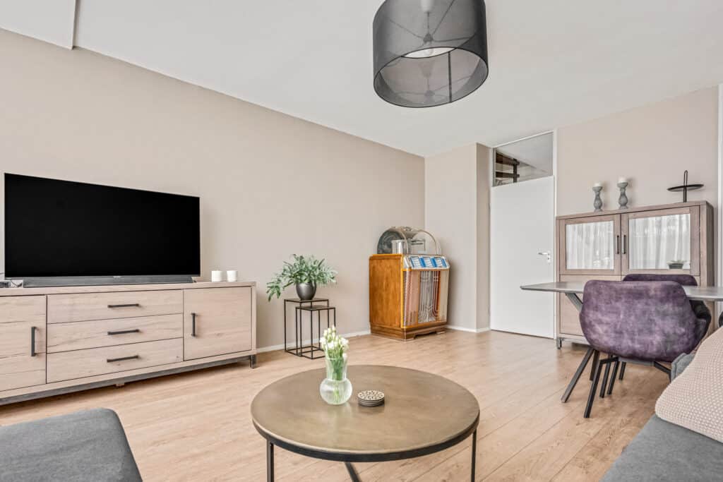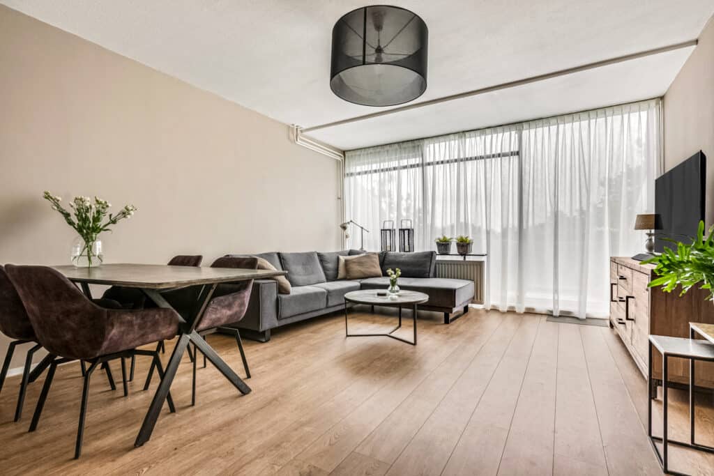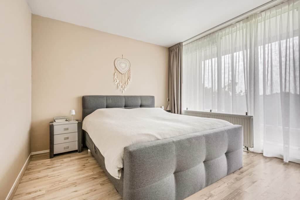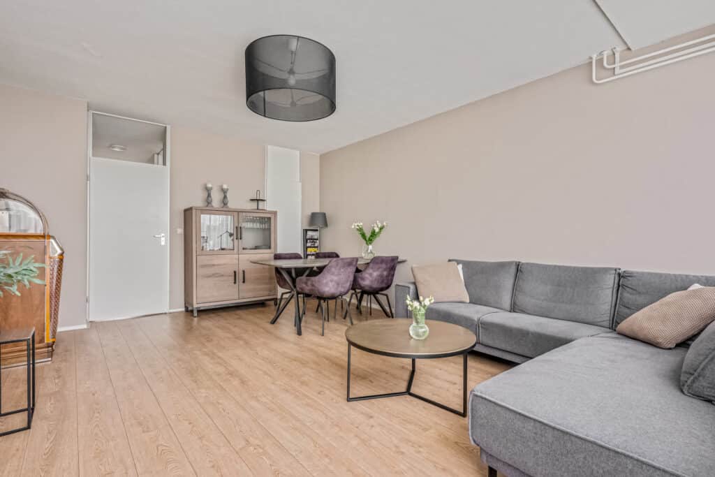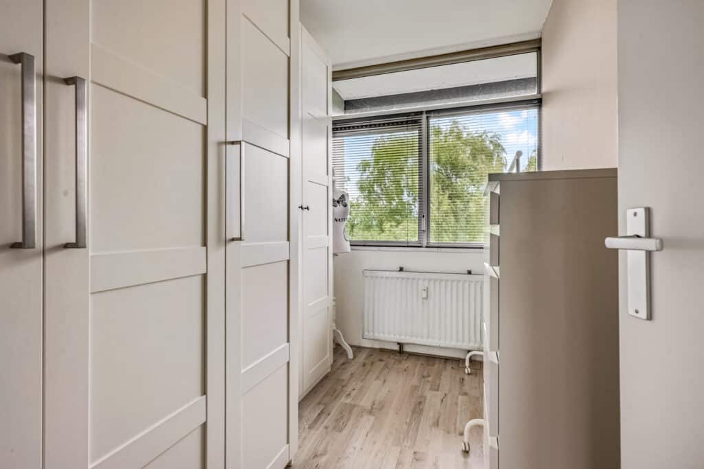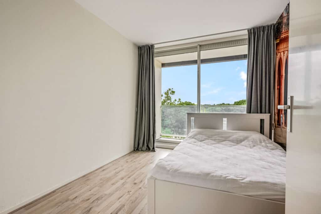 De woonkamer ligt aan de voorzijde en baadt in het licht dankzij de grote glazen pui met schuifdeur naar het balkon. Hier kun je heerlijk zitten met uitzicht op het groen. De afwerking is neutraal, met laminaatvloeren en lichte wanden – direct klaar om je eigen stijl er aan toe te voegen.