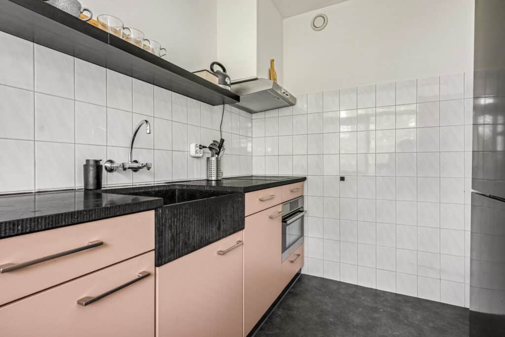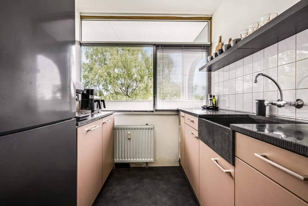 Je komt binnen in een verzorgde hal met toilet en fontein. Vanuit hier bereik je de gesloten keuken en de lichte woonkamer. De keuken, uitgevoerd in een zachte matte kleurstelling, is slim opgezet met werkbladen aan beide zijden. Het donkere stenen blad met geïntegreerde spoelbak, de inductiekookplaat (Siemens), vaatwasser (Whirlpool), combi-oven (AEG) en de opvallende wandbetegeling zorgen voor een sfeervolle en praktische werkplek. Er is volop kastruimte voor al je keukenspullen.