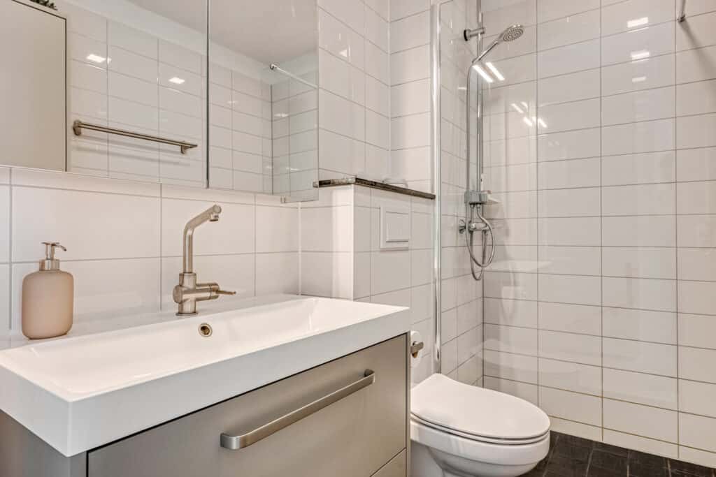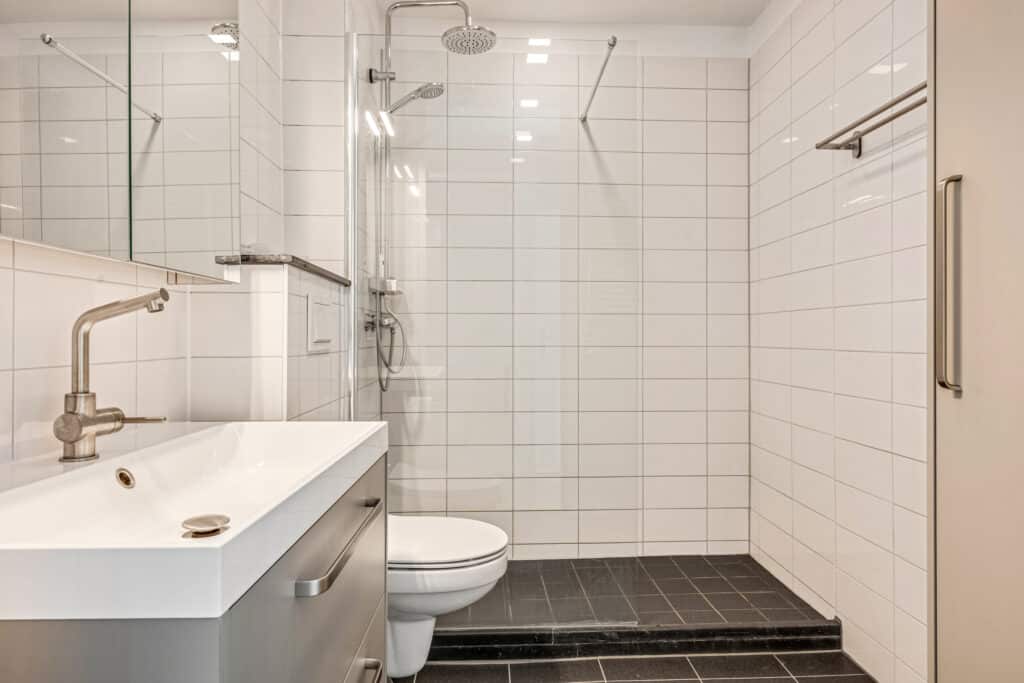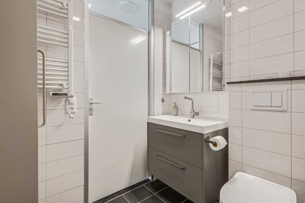 De badkamer is modern en fris, met een combinatie van donkere vloertegels, lichte wandtegels, een ruime inloopdouche met regendouche, een breed wasmeubel, een tweede toilet en dimbare verlichting voor extra sfeer.