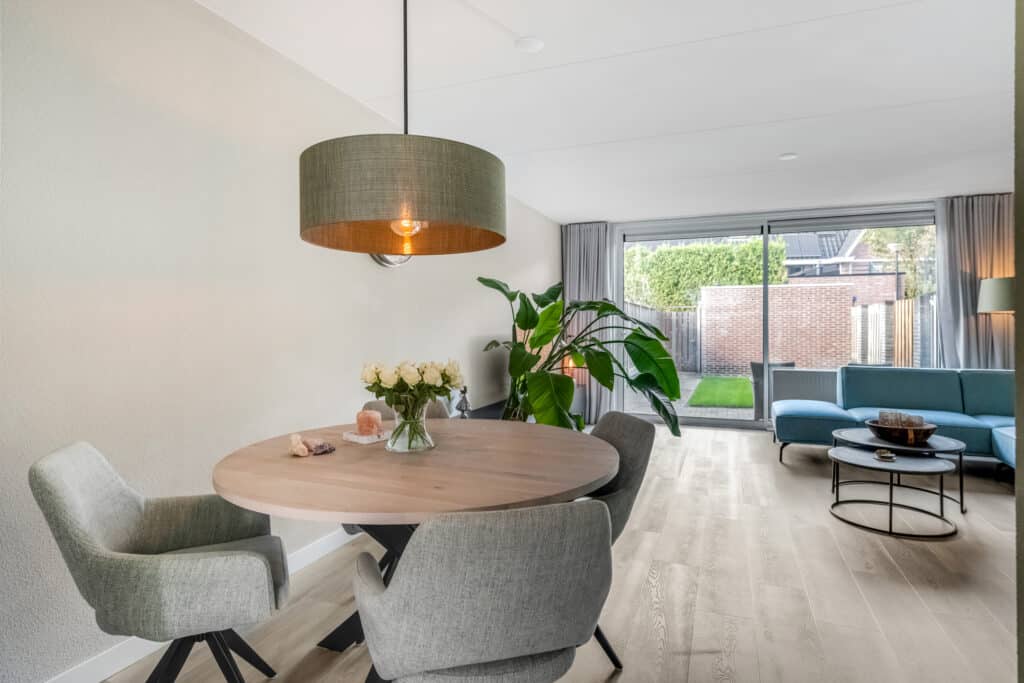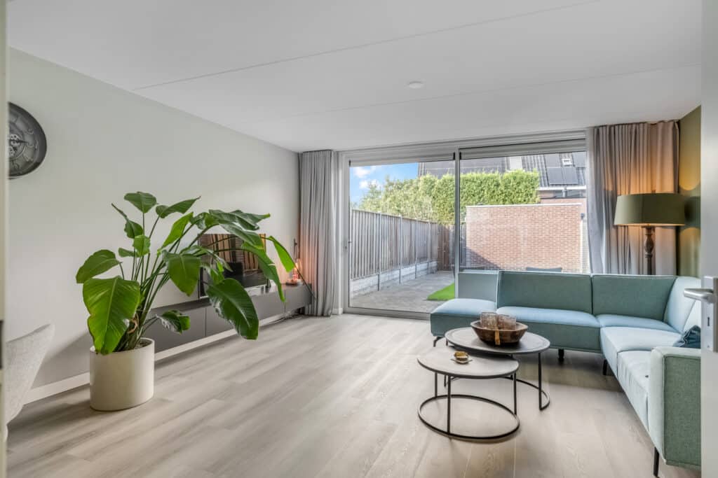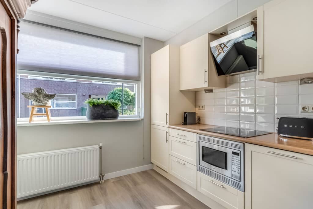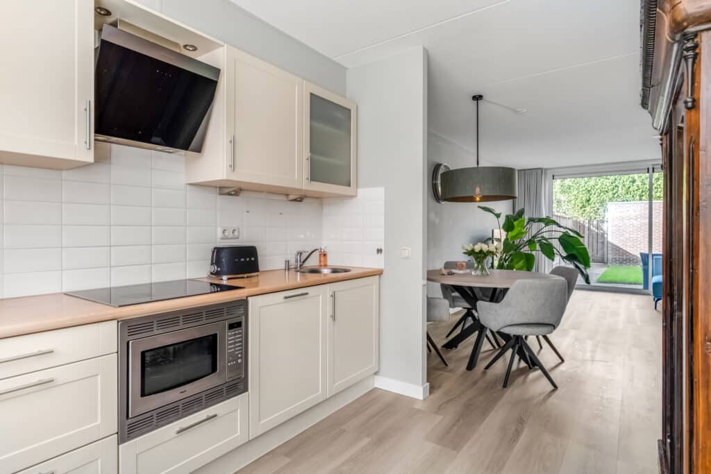 De woonkamer is een heerlijke plek om te verblijven: licht, ruim en praktisch ingedeeld. Een schuifpui met aluminium kozijnen aan de achterzijde geeft toegang tot de tuin en zorgt voor veel daglicht. Aan de voorzijde is de open keuken met speelse erker gesitueerd. Deze keuken is compleet uitgerust met een koel-vriescombinatie, 4-pits inductiekookplaat met design afzuigkap, Pelgrim magnetron, vaatwasser en stijlvolle handgewelfde wandtegels. In de woonkamer is ruimte voor een royale zithoek en een ruime eettafel.