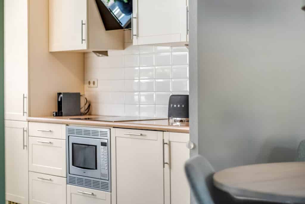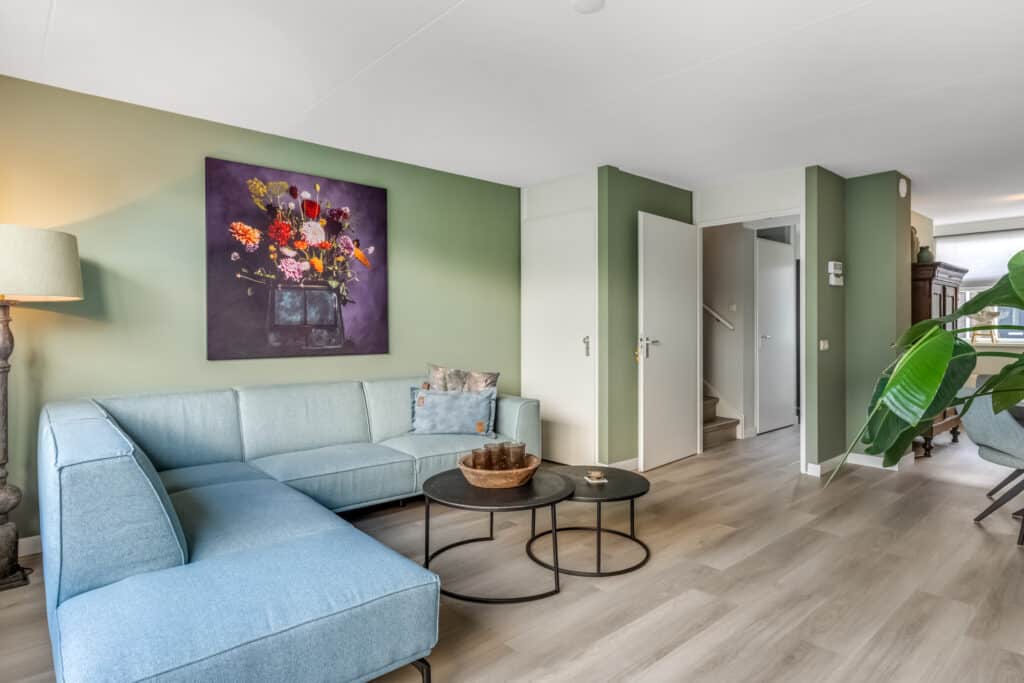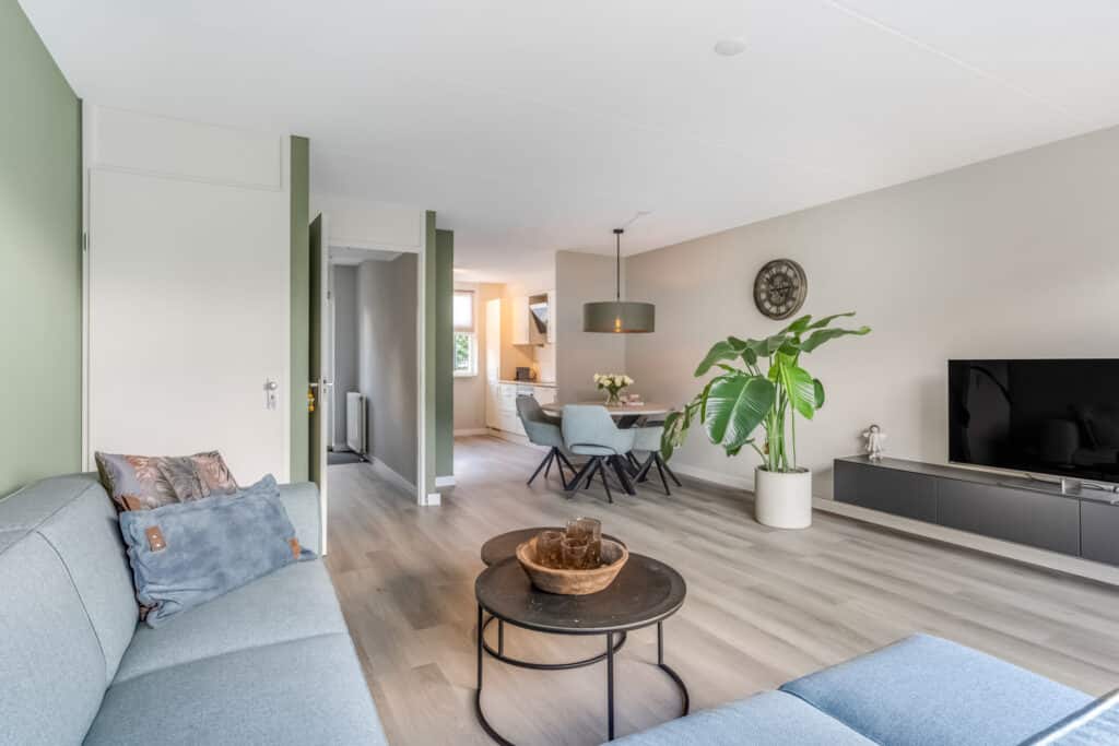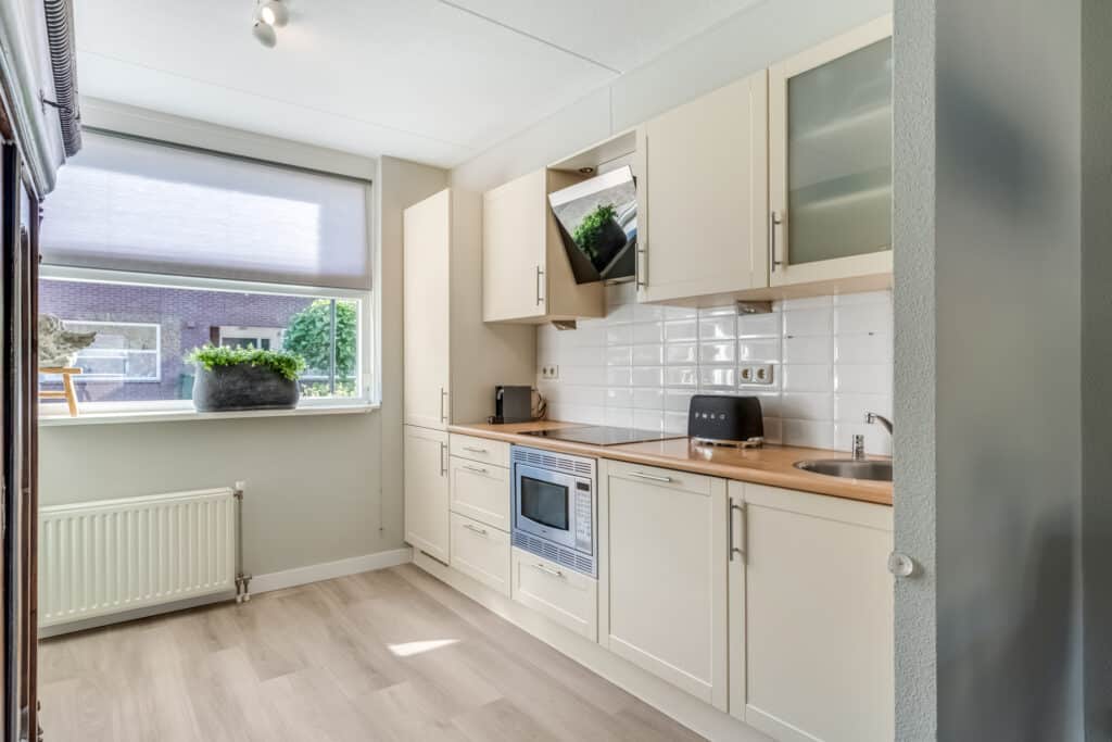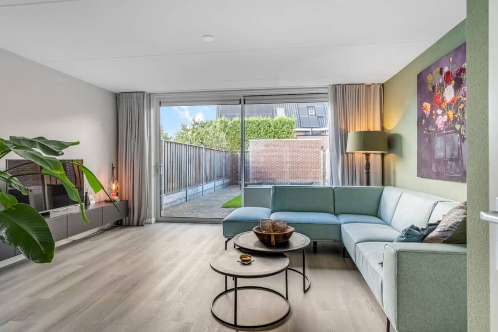 De woonkamer is een heerlijke plek om te verblijven: licht, ruim en praktisch ingedeeld. Een schuifpui met aluminium kozijnen aan de achterzijde geeft toegang tot de tuin en zorgt voor veel daglicht. Aan de voorzijde is de open keuken met speelse erker gesitueerd. Deze keuken is compleet uitgerust met een koel-vriescombinatie, 4-pits inductiekookplaat met design afzuigkap, Pelgrim magnetron, vaatwasser en stijlvolle handgewelfde wandtegels. In de woonkamer is ruimte voor een royale zithoek en een ruime eettafel.
