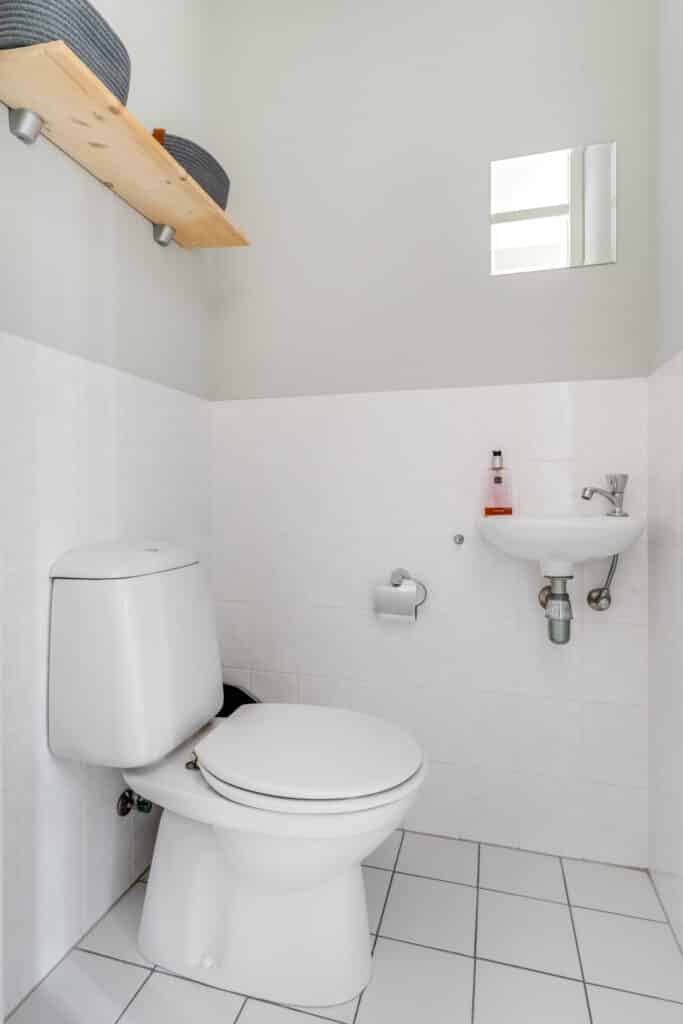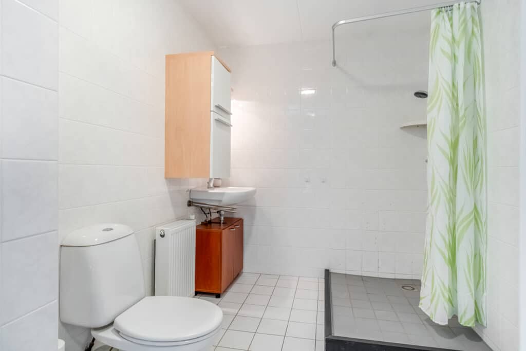 De badkamer is volledig licht betegeld en uitgerust met een douchehoek, wasmeubel, toilet en wasmachineaansluiting. Functioneel en compleet, met ruimte om desgewenst te moderniseren naar eigen smaak.