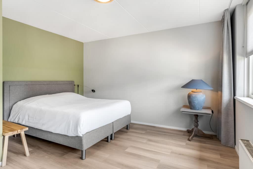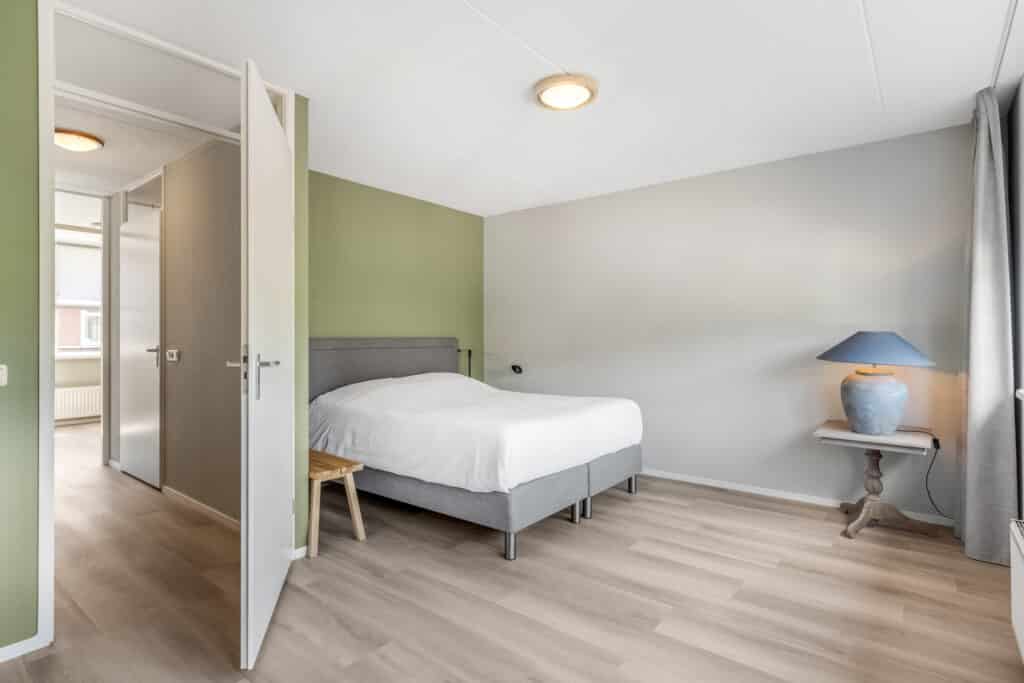 De ruime overloop biedt toegang tot twee royale slaapkamers en de badkamer. De master bedroom aan de achterzijde is bijzonder ruim omdat deze oorspronkelijk uit twee kamers bestond – dit kan eenvoudig worden teruggebracht naar de oorspronkelijke indeling, mocht u meer slaapkamers wensen. Dezelfde pvc-vloer en de neutrale kleuren zorgen voor een moderne, frisse en tijdloze uitstraling. Ook de tweede slaapkamer aan de voorzijde biedt volop ruimte en lichtinval, ideaal als kinderkamer, werkplek of logeerkamer.