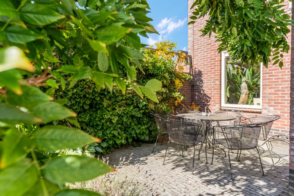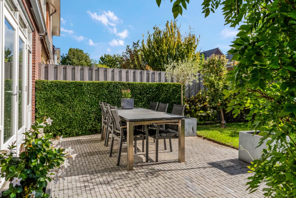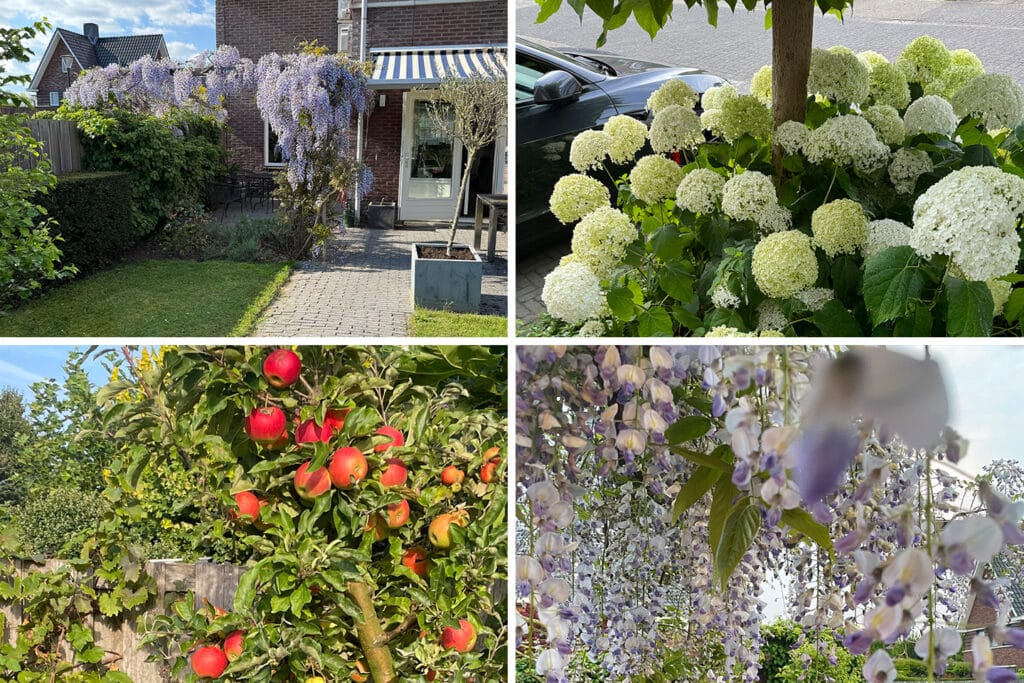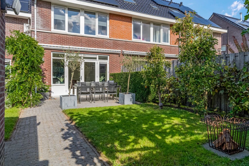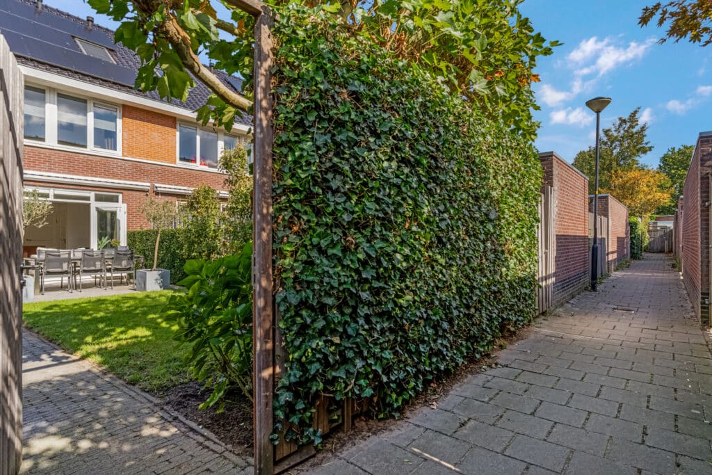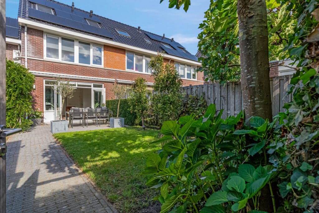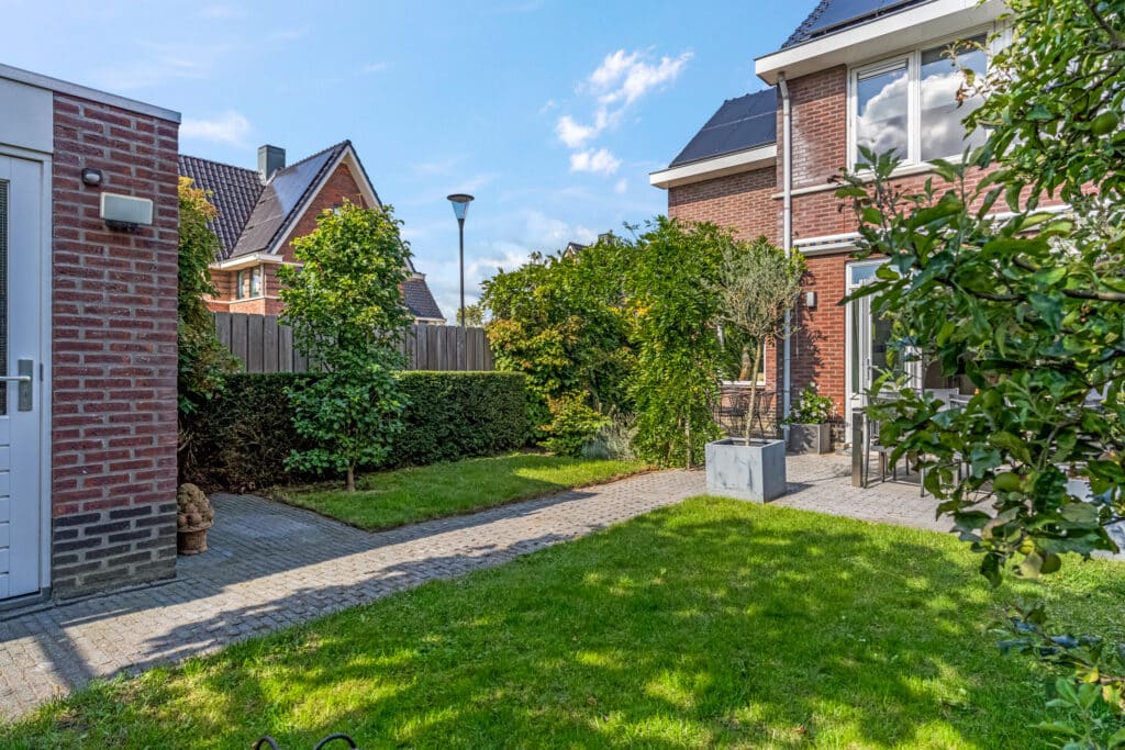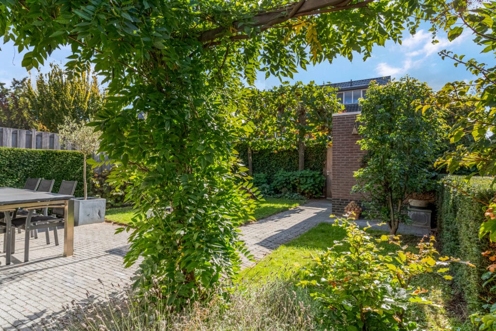 De achtertuin ligt op het zuiden en is groen, sfeervol en goed onderhouden. De beplanting is op elkaar afgestemd, zodat de tuin er elk seizoen anders uit ziet. Door de leiplatanen, klimhortensia, de pergola met blauwe regen en de groene erfafscheiding is er veel privacy, zonder in te leveren op de zon. De schuttingen, poort en de pergola zijn van hardhout. De twee Elstar appelbomen zorgen voor voldoende appels om meerdere appeltaarten te bakken. De tuin biedt meerdere zitplekken voor zowel ochtendzon als middag- en avondzon. Er staat een ruime stenen schuur en er is een achterom. De voortuin sluit mooi aan op het totaalbeeld, met o.a. taxushaag, bol catalpa’s en grote witte hortensia’s.