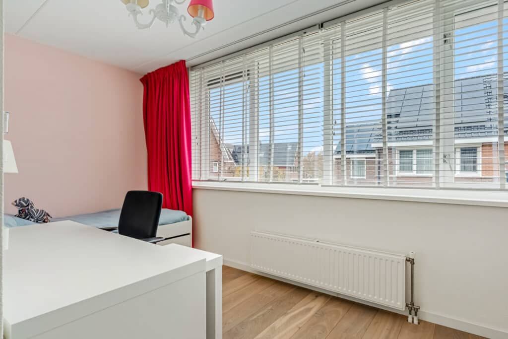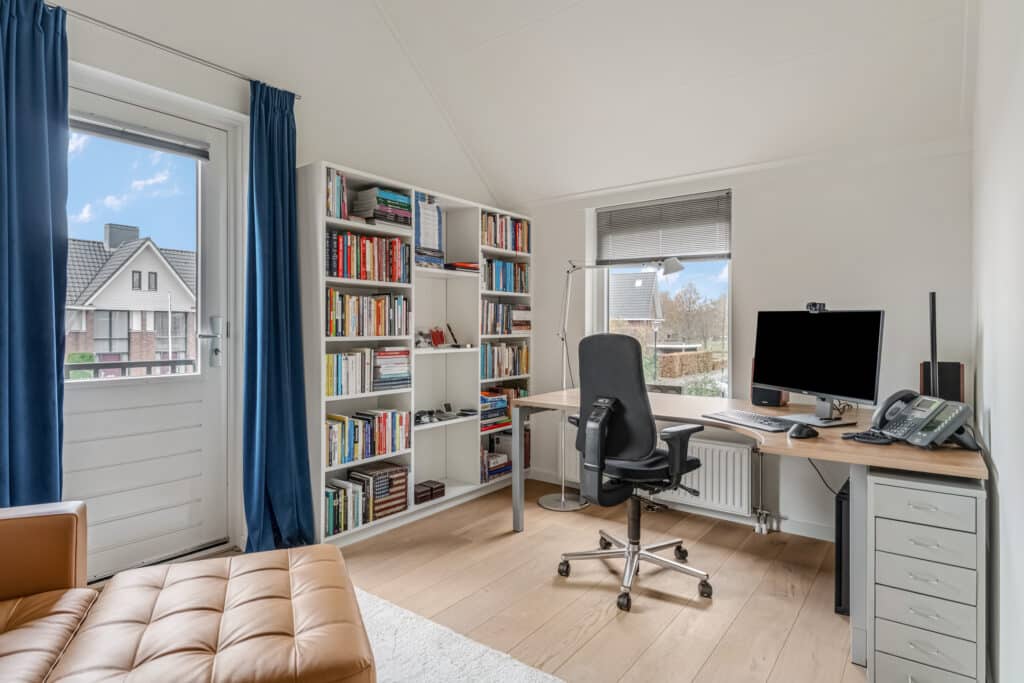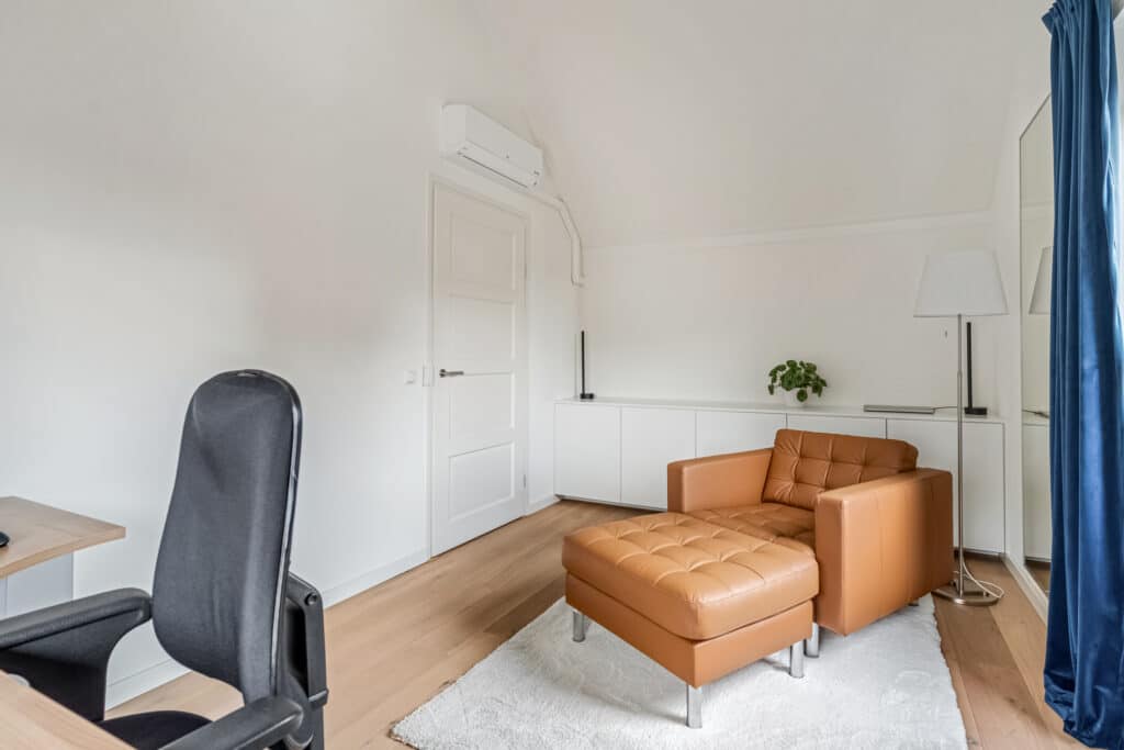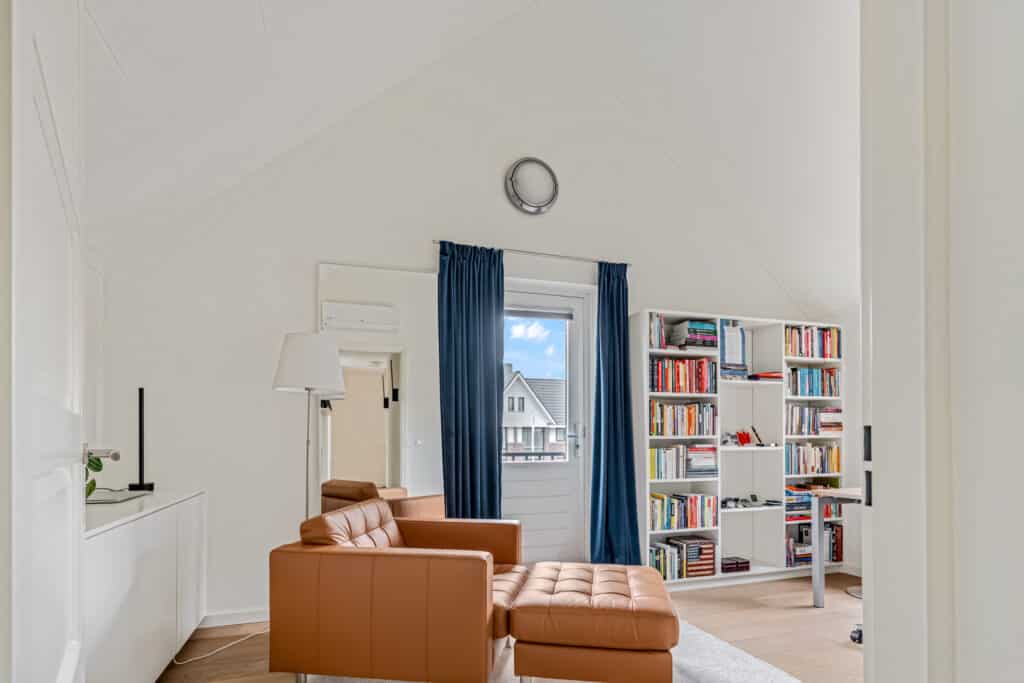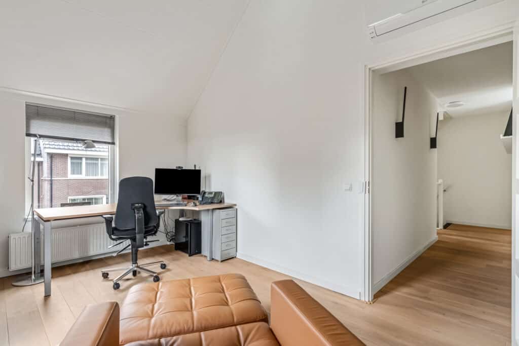 De studeerkamer aan de voorzijde is een opvallende ruimte: door het hoge puntdak heeft deze kamer een bijzondere hoogte en veel ruimtelijkheid. De vaste maatwerkkasten (zwevend over de breedte en een trio aan boekenkasten) blijven achter en maken de ruimte ideaal als kantoor, hobbykamer of extra slaapkamer. Ook deze ruimte heeft een stille vaste airco. Daarnaast hangen in de hal richting de studeerkamer twee Hue-lampen die automatisch aangaan via bewegingsdetectie. Een verdieping die rust uitstraalt en tegelijkertijd volop mogelijkheden biedt.