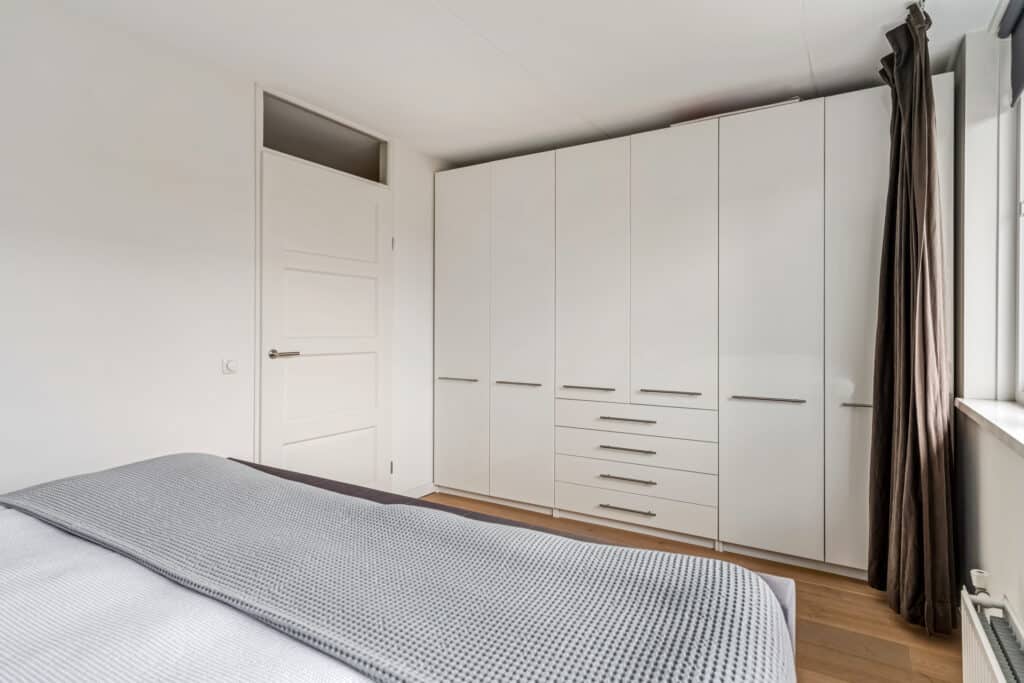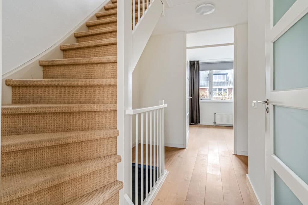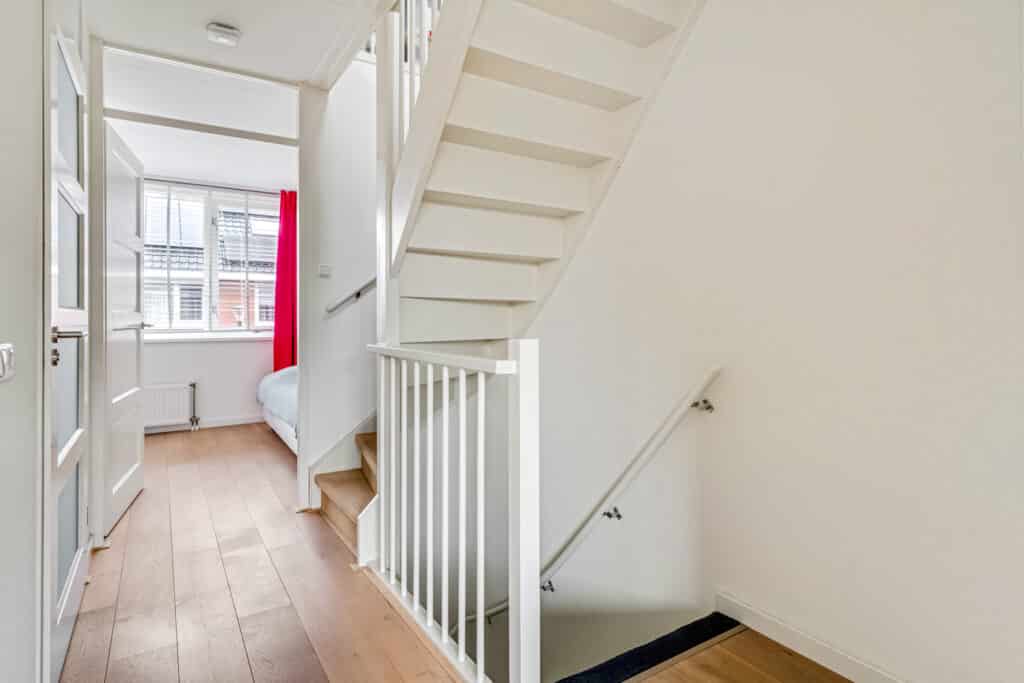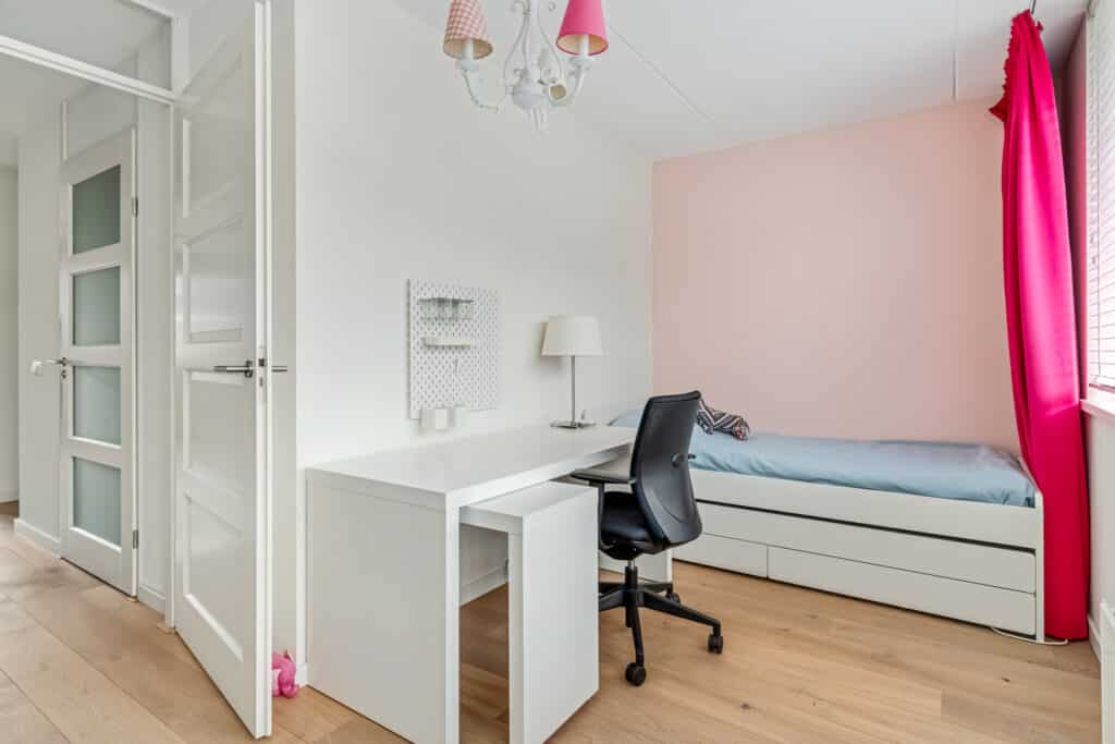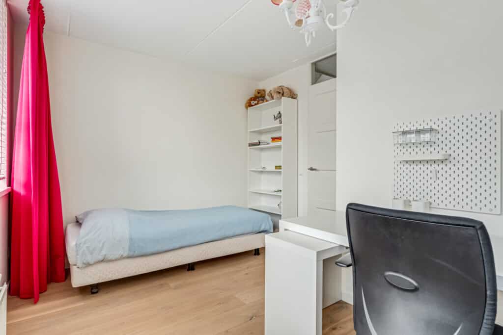 De studeerkamer aan de voorzijde is een opvallende ruimte: door het hoge puntdak heeft deze kamer een bijzondere hoogte en veel ruimtelijkheid. De vaste maatwerkkasten (zwevend over de breedte en een trio aan boekenkasten) blijven achter en maken de ruimte ideaal als kantoor, hobbykamer of extra slaapkamer. Ook deze ruimte heeft een stille vaste airco. Daarnaast hangen in de hal richting de studeerkamer twee Hue-lampen die automatisch aangaan via bewegingsdetectie. Een verdieping die rust uitstraalt en tegelijkertijd volop mogelijkheden biedt.