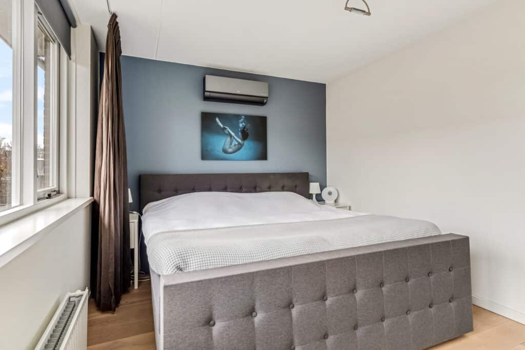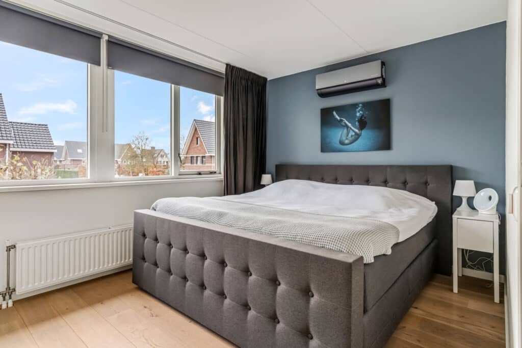 Op de eerste verdieping ligt een doorlopende houten vloer die de verdieping een warme en rustige uitstraling geeft. De master bedroom is ruim en heeft een grote vaste design airco die fluisterstil werkt. De royale Ikea-kastenwand blijft achter. De tweede slaapkamer is eveneens royaal en licht.