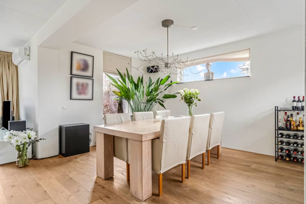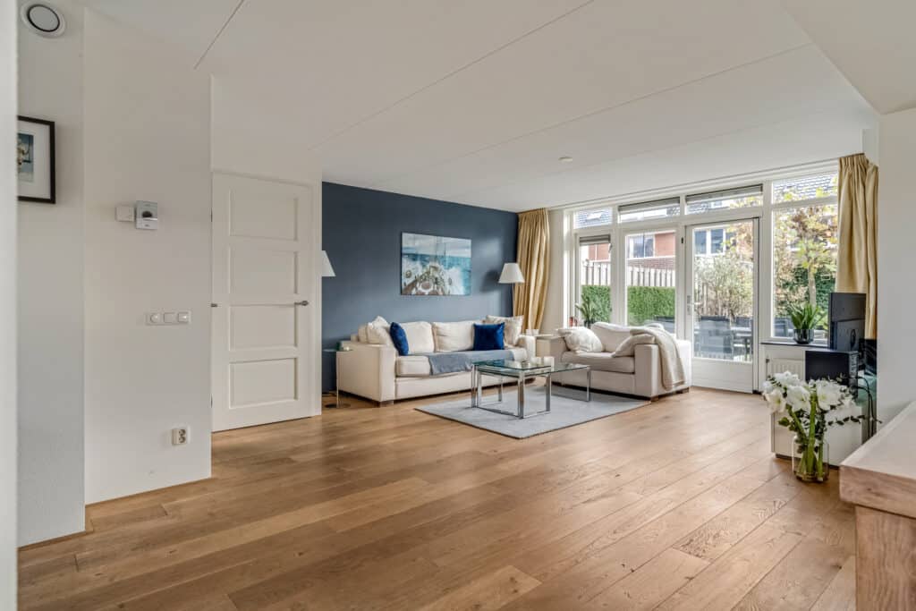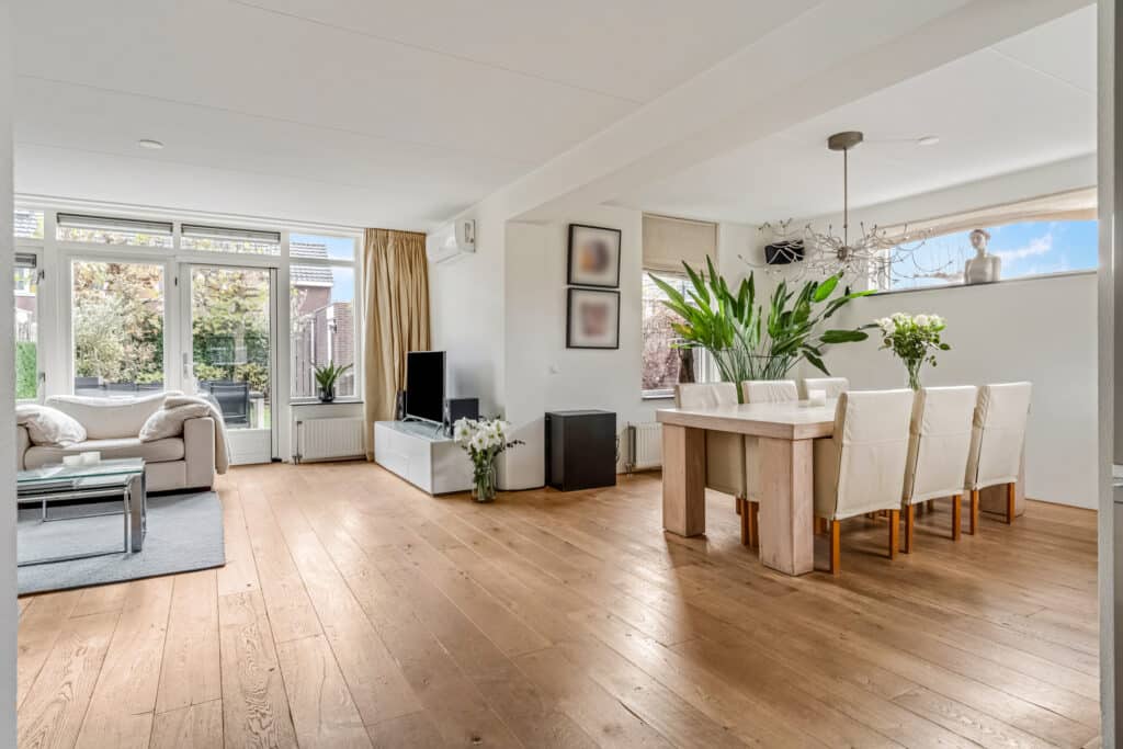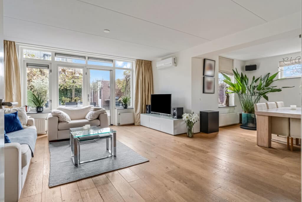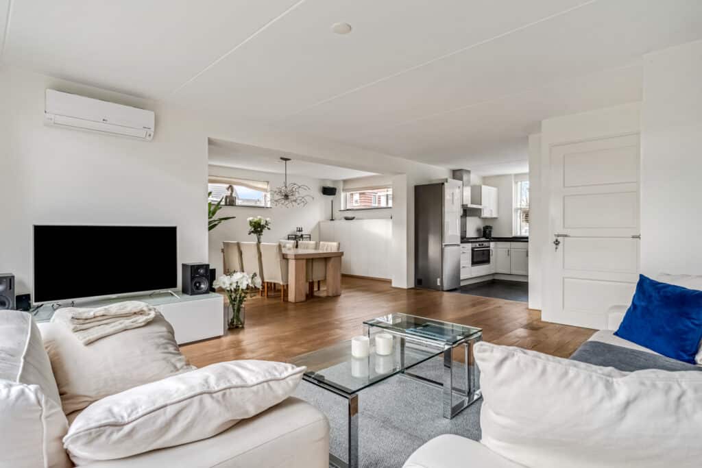Bij binnenkomst valt direct de nette afwerking op: een moderne meterkast met krachtstroom en tussenmeter (voor de laadpaal op de eigen oprit), een donkerkleurige tegelvloer en een verzorgd toilet met fontein. Door de slimme domotica en bewegingssensoren voelt deze woonlaag direct modern en comfortabel aan. Dankzij de hoekligging is de woonkamer met houten vloerdelen verrassend ruim. De brede zithoek ligt aan de tuinzijde en heeft veel licht door de grote raampartijen met openslaande deuren naar het terras. Op zonnige dagen lopen binnen en buiten hier bijna naadloos in elkaar over. De vaste airco-unit koelt en verwarmt zeer stil en comfortabel. De zwevende maatwerk inbouwkast past in het geheel en geeft veel praktische opbergruimte. Op deze kast staan twee Philips Hue lampen die mooi indirect licht geven.