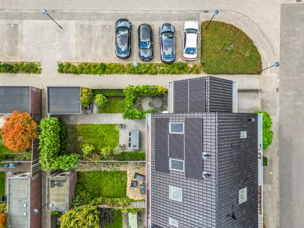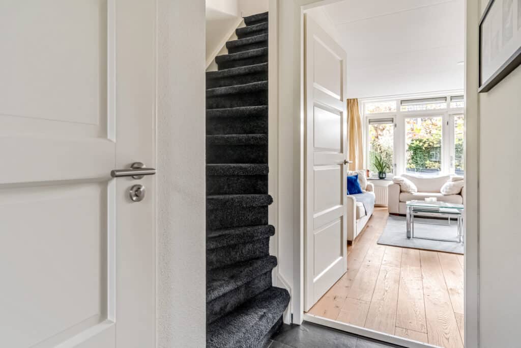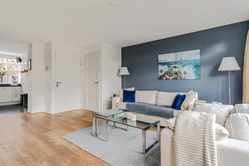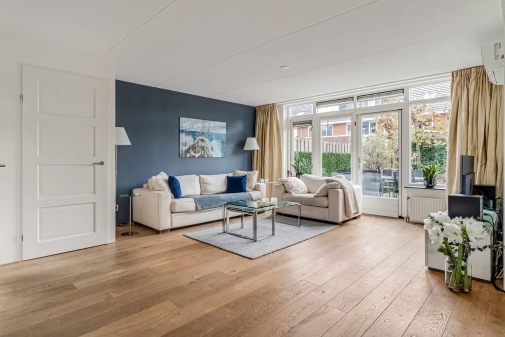 Bij binnenkomst valt direct de nette afwerking op: een moderne meterkast met krachtstroom en tussenmeter (voor de laadpaal op de eigen oprit), een donkerkleurige tegelvloer en een verzorgd toilet met fontein. Door de slimme domotica en bewegingssensoren voelt deze woonlaag direct modern en comfortabel aan. Dankzij de hoekligging is de woonkamer met houten vloerdelen verrassend ruim. De brede zithoek ligt aan de tuinzijde en heeft veel licht door de grote raampartijen met openslaande deuren naar het terras. Op zonnige dagen lopen binnen en buiten hier bijna naadloos in elkaar over. De vaste airco-unit koelt en verwarmt zeer stil en comfortabel. De zwevende maatwerk inbouwkast past in het geheel en geeft veel praktische opbergruimte. Op deze kast staan twee Philips Hue lampen die mooi indirect licht geven.
