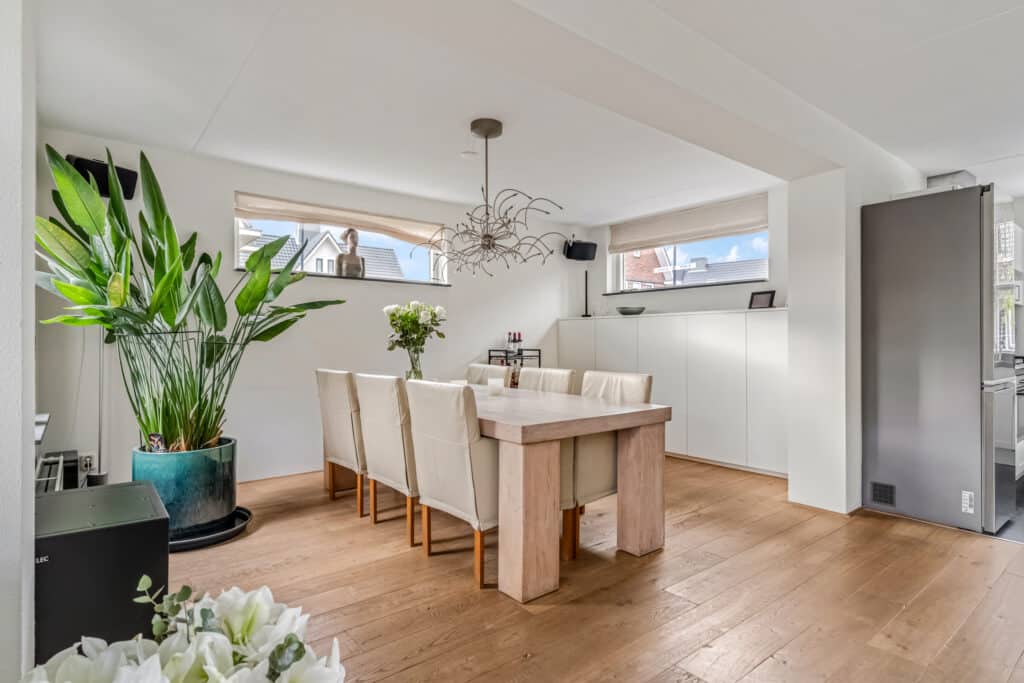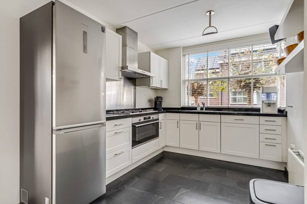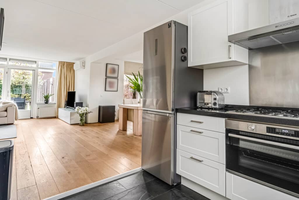 Aan de voorzijde ligt de open keuken. Deze is netjes, functioneel en fris. De apparatuur is de afgelopen jaren volledig vernieuwd: een brede Bosch-oven waar makkelijk twee pizza’s tegelijk in passen, een vijfpits gasfornuis met wokbrander, een Miele-vaatwasser, een grote Samsung koel-vriescombinatie en een stille RVS Bosch-afzuigkap. Een fijne plek om te koken met meer dan voldoende werk- en kastruimte. Op de begane grond hangen drie Sonos-speakers en een Sonos Subwoofer die eventueel over te nemen zijn.