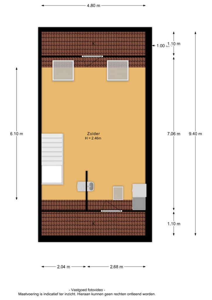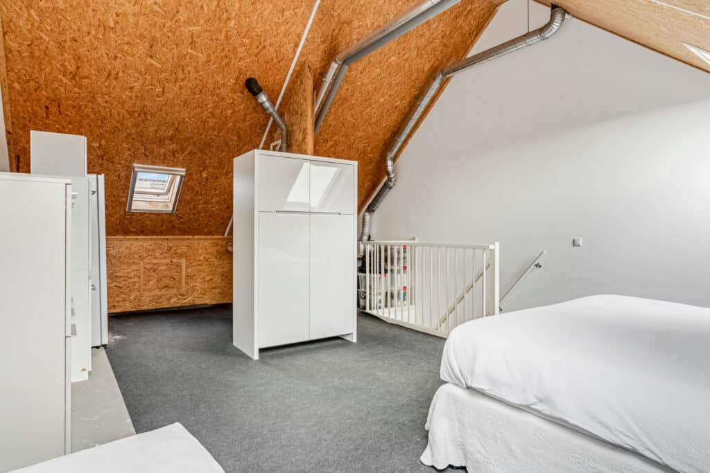 De tweede verdieping is volledig open en voelt ruim en licht dankzij de hoogte en de drie dakramen. Twee grote dakramen liggen aan de zonzijde, ieder met zonwering, en aan de andere zijde bevindt zich een derde dakraam voor een uitstekende doortocht. Deze verdieping biedt volop mogelijkheden: direct te gebruiken als werk- of logeerruimte, of eenvoudig in te delen in meerdere kamers.