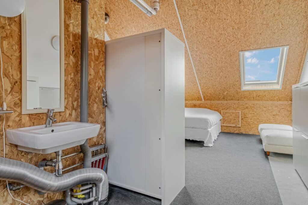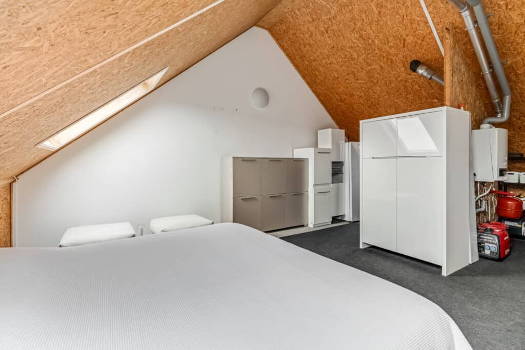 Hier bevinden zich ook de technische voorzieningen, waaronder de jonge Nefit-combiketel, mechanische ventilatie en de omvormer voor de 18 zonnepanelen. De ketel is gekoppeld aan een Bosch-app voor bediening en monitoring. Op deze verdieping is tevens een Nest Protect rookmelder aanwezig, net als op de overige verdiepingen.