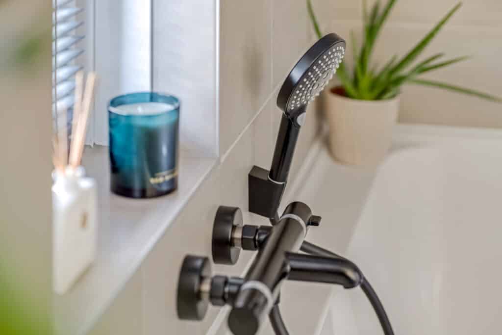 De badkamer is een waar wellnessgevoel in eigen huis. Hier is gekozen voor een stijlvolle combinatie van lichte tegels, zwarte accenten en warme houtdetails. Het resultaat is een harmonieuze en luxe ruimte met een ruime inloopdouche, een design ligbad onder het raam en een breed wasmeubel met dubbele wastafel. Alles klopt hier, tot in de kleinste details. Ook het separate toilet op de overloop is in dezelfde stijl uitgevoerd, wat zorgt voor een mooi geheel.