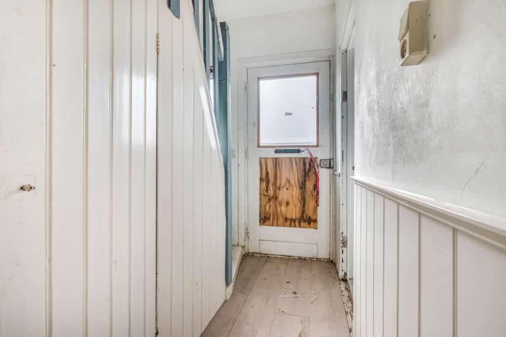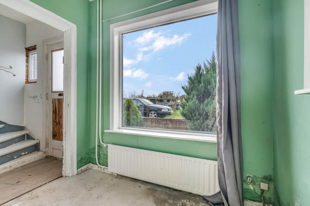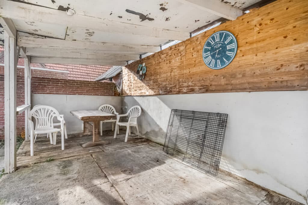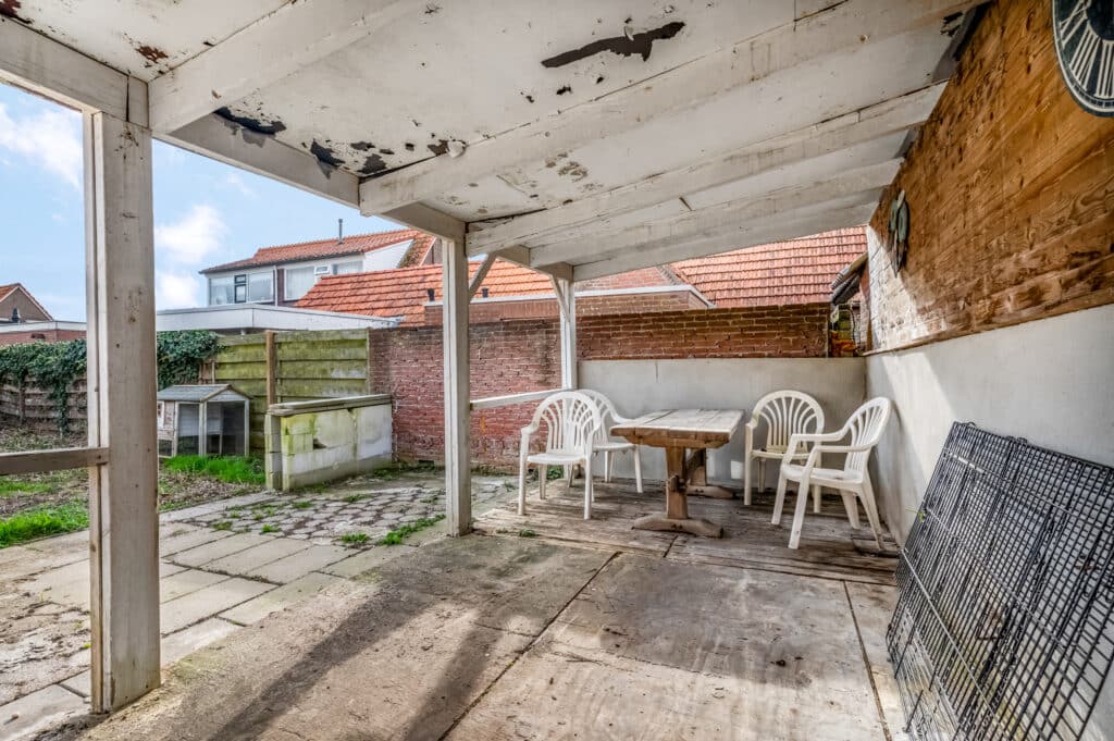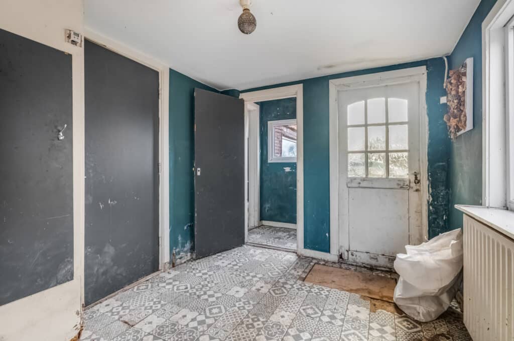 Bij deze woning komen we binnen via de ‘achterom’. We treffen hier de hal/bijkeuken met toegang tot de badkamer, ruime schuur en richting de keuken. Vervolgens lopen we door naar het leefgedeelte dat bestaat uit een zitkamer. Er is een separaat toilet aanwezig.