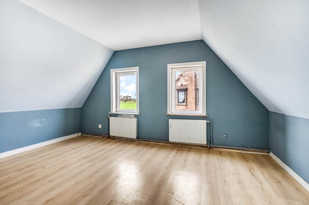 Via de woonkamer komen we in de officiële entree van de woning die middels een vaste trap de weg naar boven voorziet. Hier is een open ruimte aanwezig bestemd als slaapkamer.