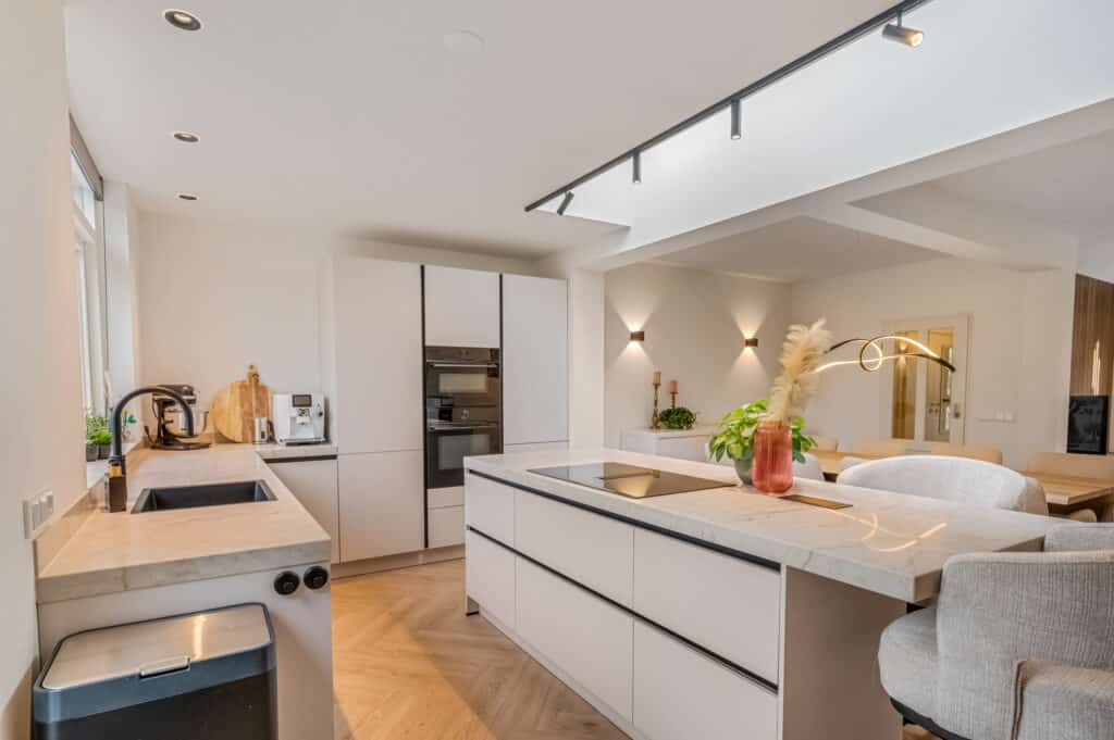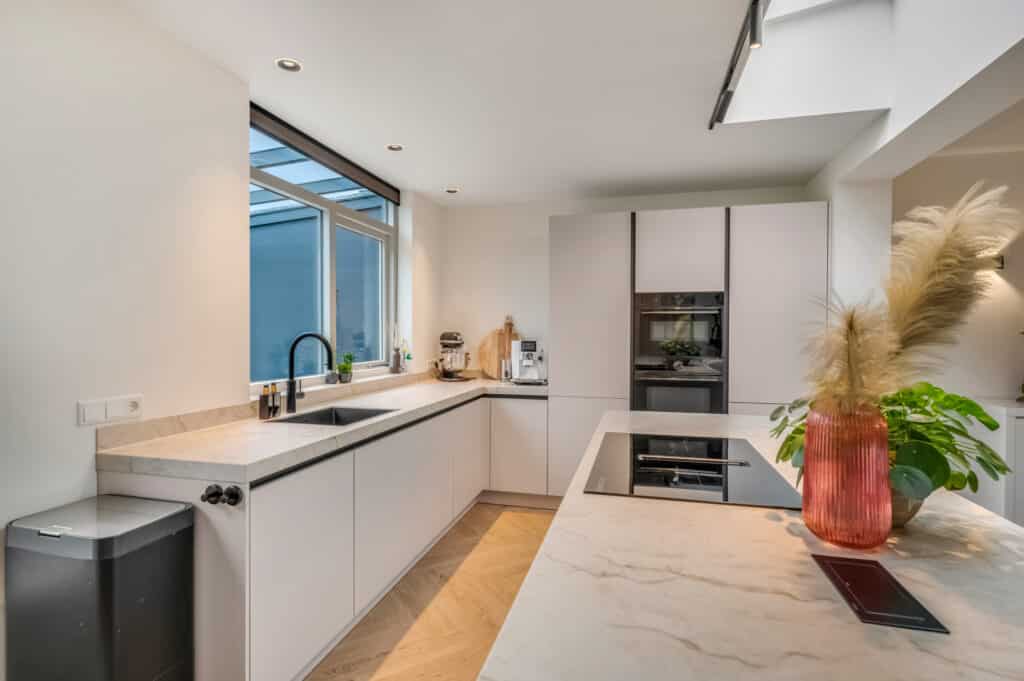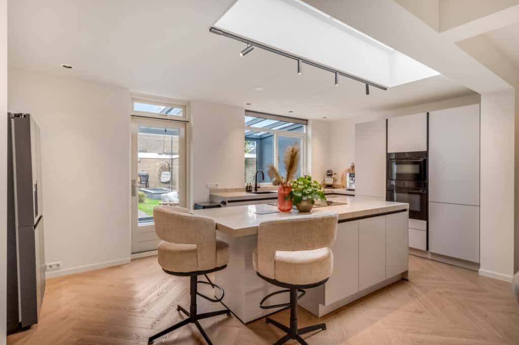 Zodra je de keuken binnenstapt, voel je het meteen: dit is het kloppend hart van het huis. De prachtige uitbouw met lichtstraat laat het daglicht van alle kanten binnenstromen, waardoor deze ruimte een open, lichte en uitnodigende sfeer krijgt. Hier is in 2025 met oog voor detail en kwaliteit een splinternieuwe keuken gerealiseerd – een keuken die niet alleen functioneel perfect is, maar ook qua uitstraling een statement maakt.