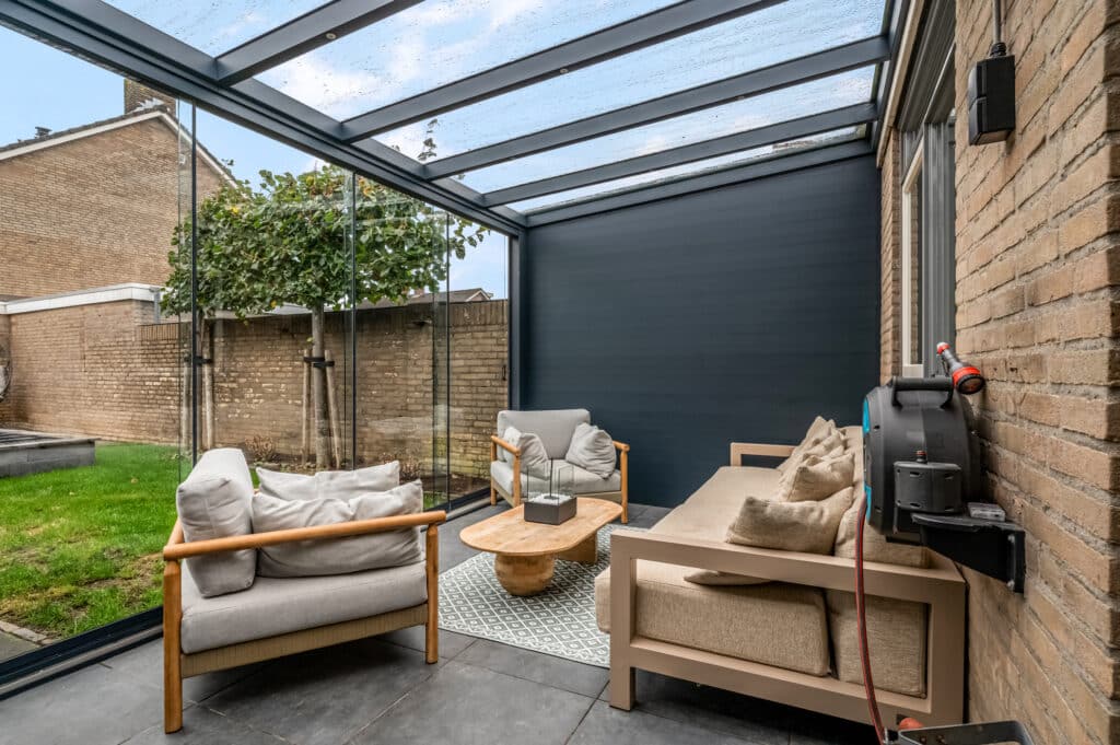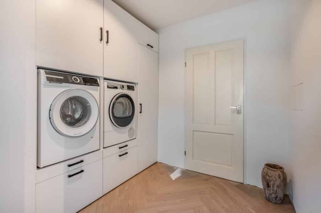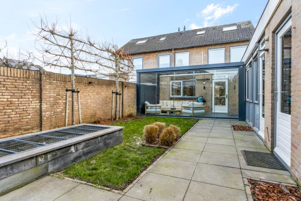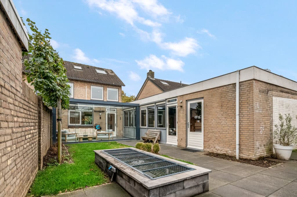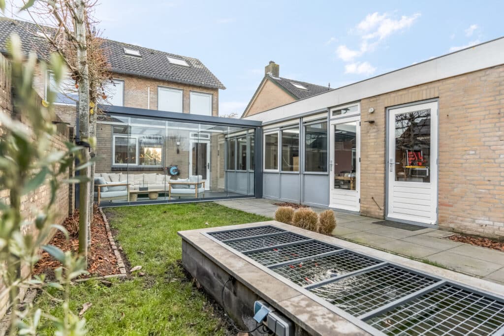 Via de keuken stap je de aangebouwde serre binnen, voorzien van spots en glazen schuifwanden naar de tuin. Deze ruimte verlengt het binnen leven naar buiten – ideaal voor elk seizoen. De bijkeuken is slim ontworpen met een ingebouwde kastenwand voor wasmachine en droger. Vanuit hier heb je toegang tot zowel de carport aan de voorzijde als de achtergelegen unieke ruimte van deze woning.