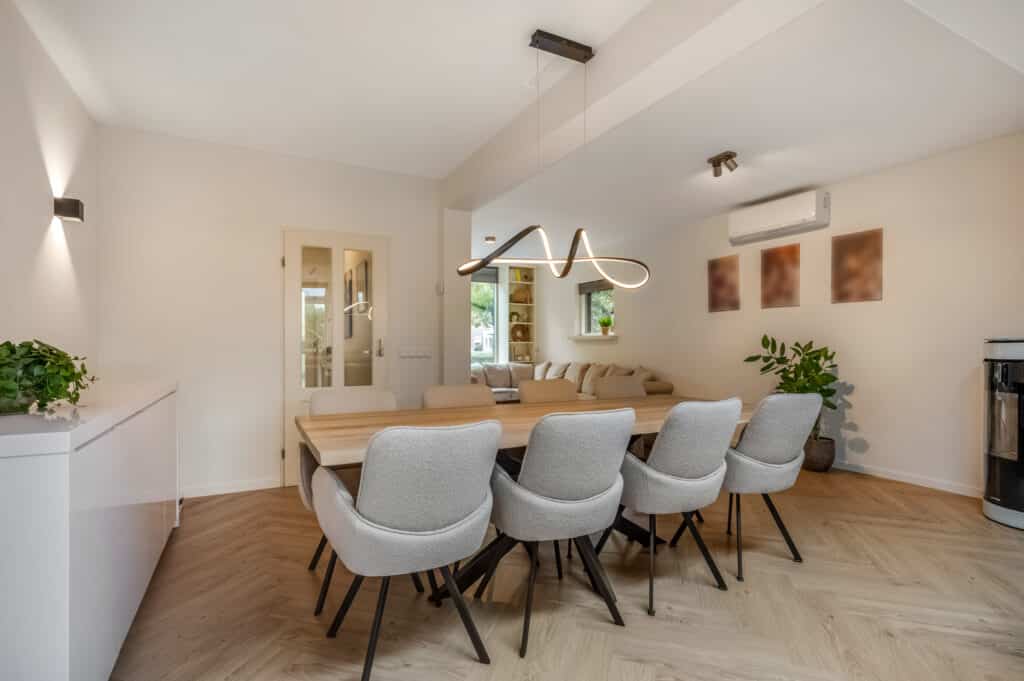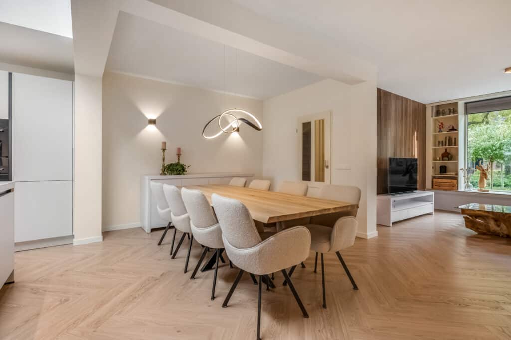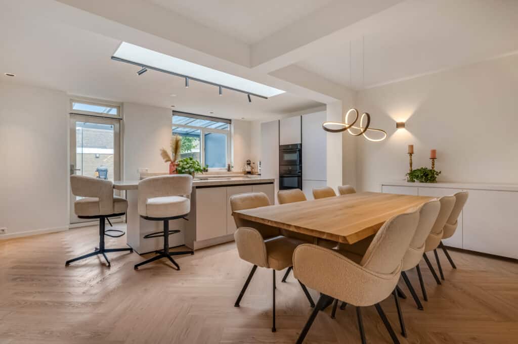 Tussen de zitkamer en de keuken is voldoende ruimte voor een royale eettafel – dé plek voor lange diners en gezellige avonden met vrienden of familie.