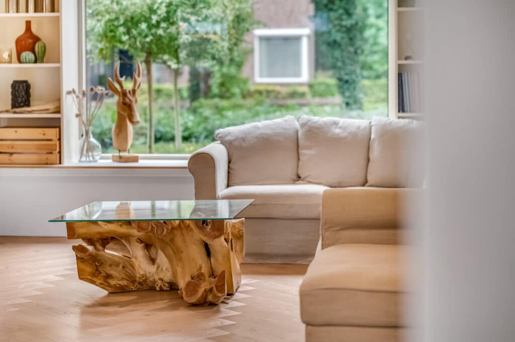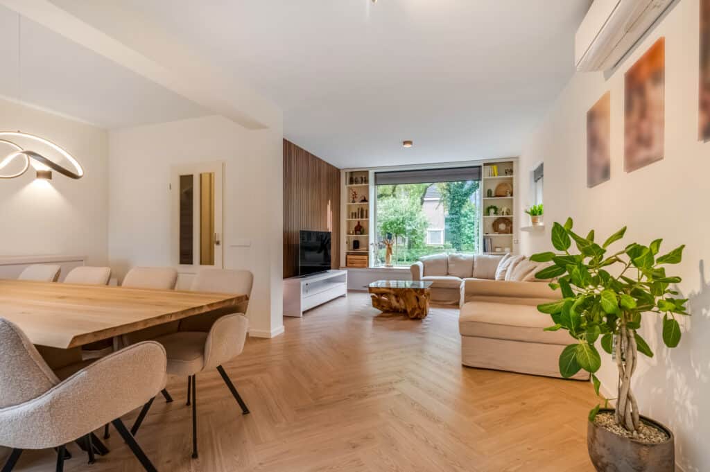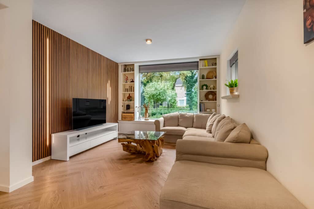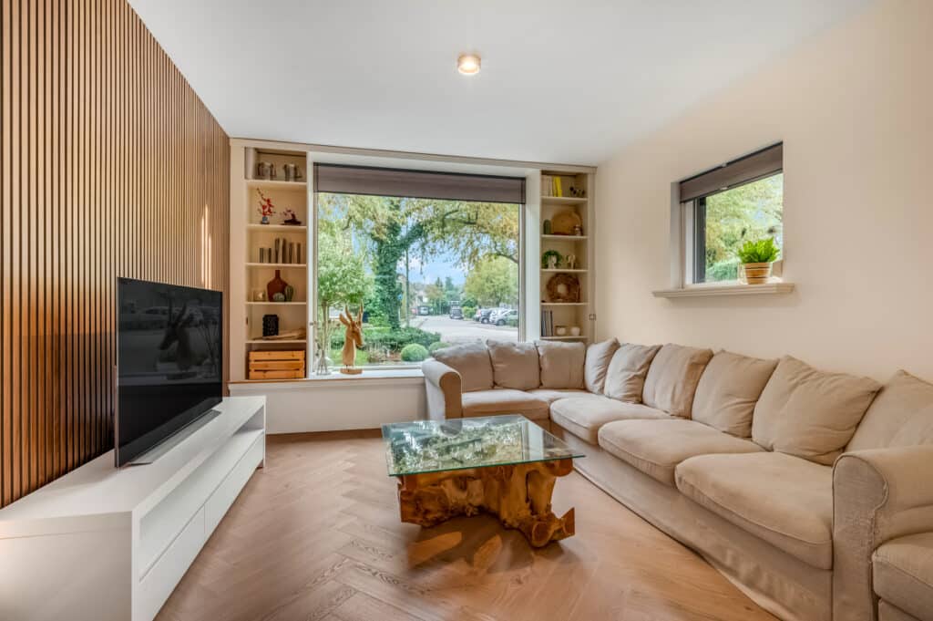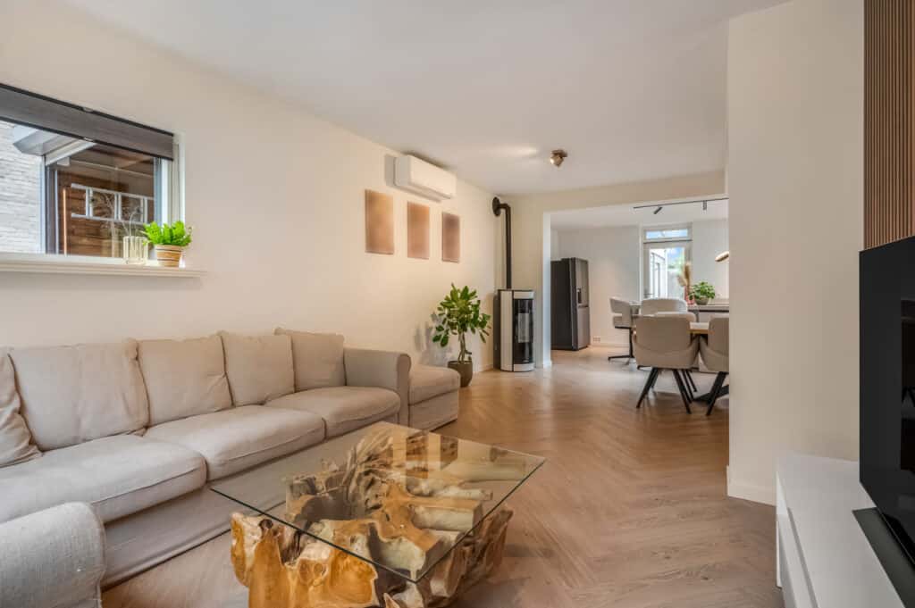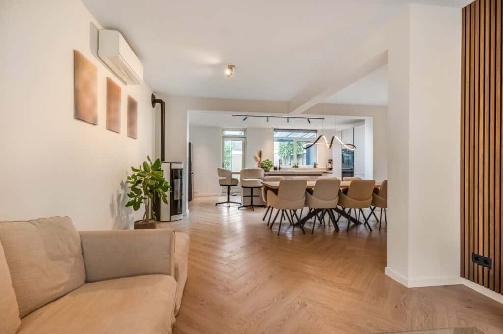 De woonkamer is één open, gezellige leefruimte geworden – het hart van het huis. De combinatie van de pellet kachel en airconditioning zorgt het hele jaar door voor het ideale binnenklimaat. Grote ramen aan de voorzijde laten het daglicht rijkelijk binnenvallen, terwijl de prachtige Cinewall en sfeervolle verlichting zorgen voor een moderne en warme sfeer.