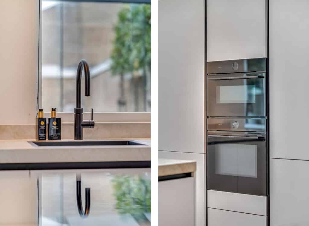 Qua apparatuur is werkelijk aan alles gedacht. Het kookeiland is uitgerust met een Bosch inductiekookplaat met geïntegreerde afzuiging (werkt op wifi), waardoor koken een plezierige, geurvrije ervaring wordt. Twee combi-ovens op wifi bieden eindeloze mogelijkheden voor elke kookliefhebber, terwijl de vaatwasser met wifi en de Quooker voor direct kokend water het dagelijkse gemak compleet maken.