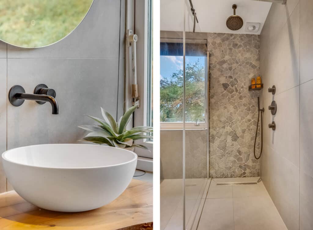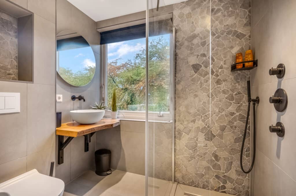 De badkamer is een parel op zich, waar design, comfort en luxe samenkomen. Vanaf het moment dat je binnenstapt, ervaar je de sfeer van een eigen wellnessruimte. Het zwevend matwitte toilet oogt strak en modern, terwijl de waskom op een houten blad in combinatie met de zwarte inbouwkraan een warm en eigentijds contrast biedt. De regen- en handdouche nodigt uit tot ontspanning en is voorzien van een subtiel nisje, afgewerkt met mozaïektegels die een elegante en luxe touch geven. Het stijlvolle tegelwerk in antraciet en lichtgrijs versterkt de moderne uitstraling. Hier ervaar je het gevoel van een luxe spa in het comfort van je eigen huis: een badkamer waar je kunt ontspannen, tot rust kunt komen en elke dag kunt beginnen en eindigen in stijl en comfort.