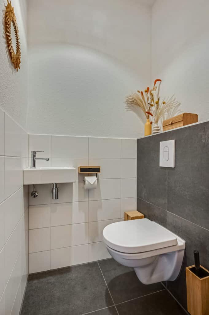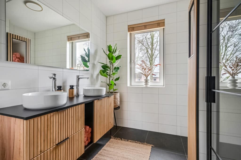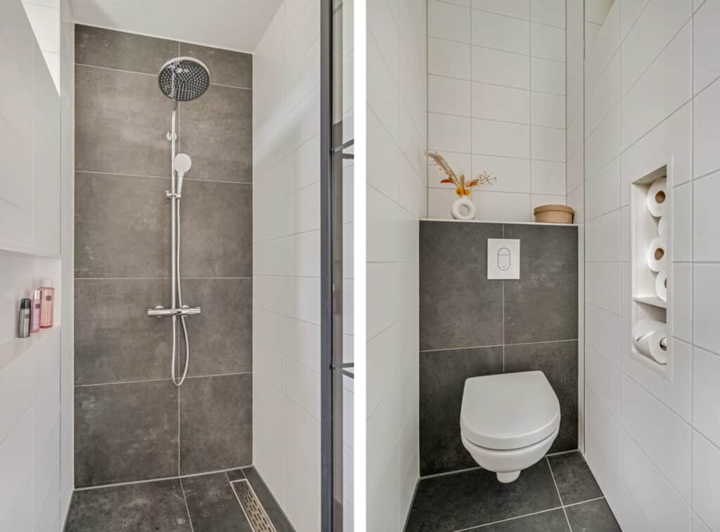 De badkamer is een absolute eyecatcher. Luxe, stijlvol en voorzien van alle comfort: een dubbel wastafelmeubel (1,40 breed) met twee waskommen, spiegel met verwarmingselement en daarachter wandlichtpunt voor eventuele verlichting, een ruime, extra brede, inloopdouche met regendouche en zwarte accenten, toilet soft close, tussenwand met fraaie nisjes en een programmeerbare designradiator. Het geheel is uitgevoerd in een chique donkere tegelstelling die zorgt voor een hotelwaardige uitstraling.