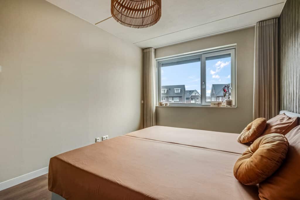 Via de vaste trap naar de verdieping. Eind 2025 is deze gerenoveerd met overzettreden van laminaat. Op de eerste verdieping vind je drie volwaardige slaapkamers, allemaal afgewerkt met dezelfde hoogwaardige PVC vloer (houtlook stroken) en voorzien van vloerverwarming en -koeling. Grote raampartijen zorgen voor een prettige lichtinval en een ruimtelijk gevoel. De afwerking is ook hier tot in detail verzorgd, met strakke wanden van renovlies en een harmonieuze uitstraling. Iedere kamer is voorzien van extra WCD’s, tevens in alle kasten voor kastverlichting. Ten slotte vinden we op de kamers handmatige en elektrische rolluiken.