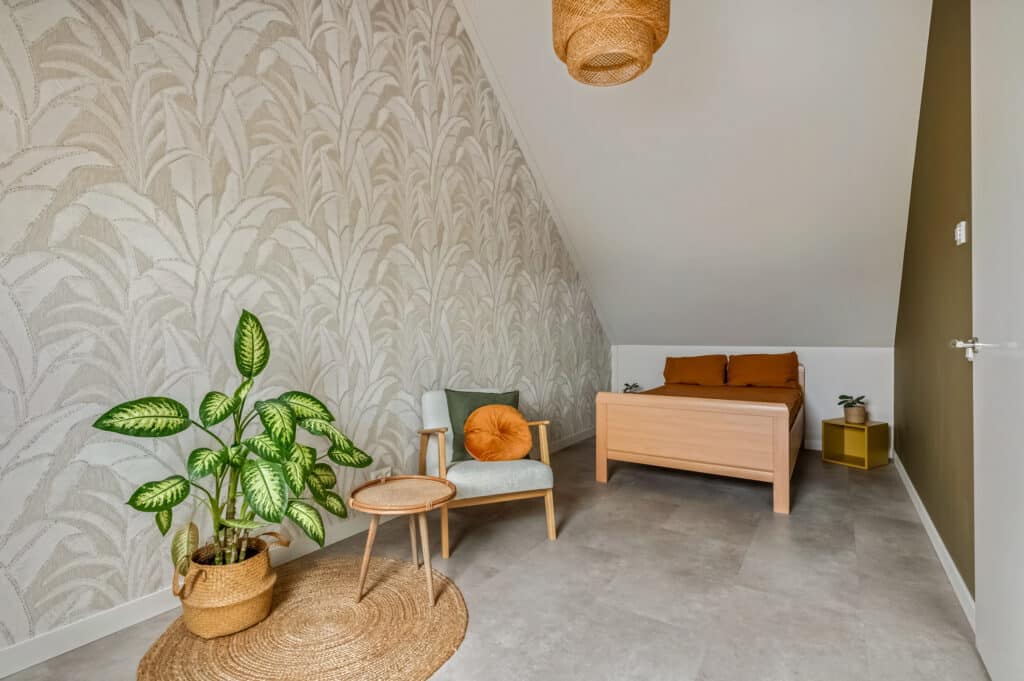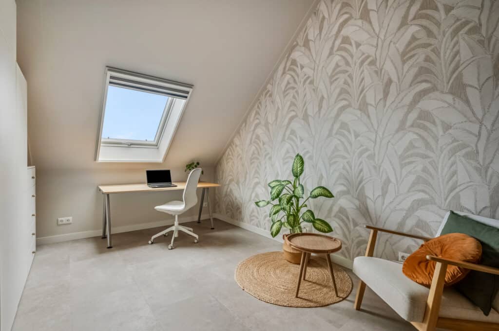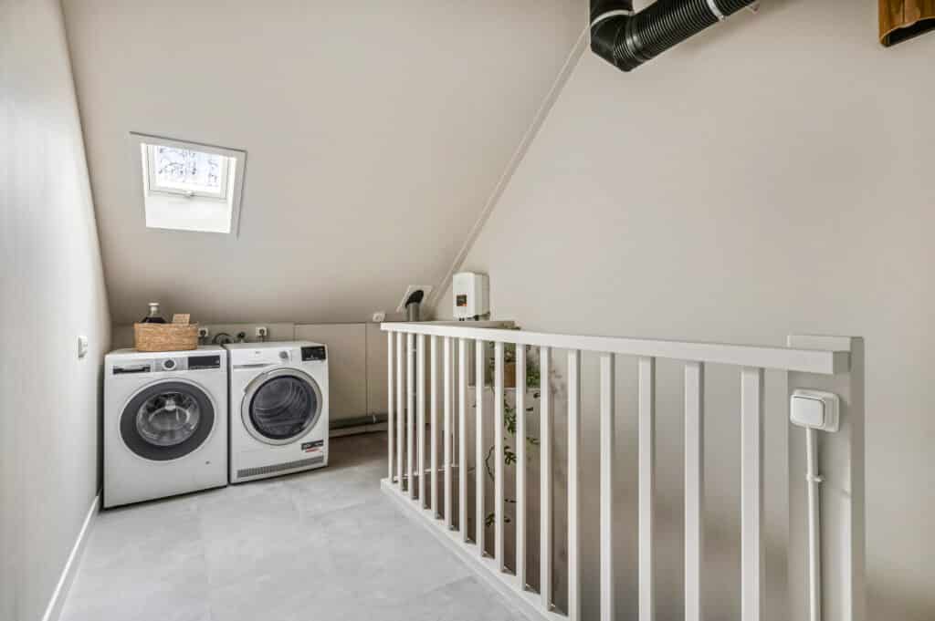 De zolder is verrassend ruim en praktisch ingedeeld. Via een strak afgewerkte vaste trap (ook renovatie 2025 met laminaat overzettreden) bereik je de voorzolder met aansluitingen voor wasmachine en droger. Daarnaast is er een separate bergruimte met invulling van de technische installaties. Ook deze verdieping is kwalitatief afgewerkt met arte behang en renovlies behang.