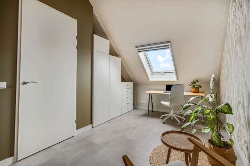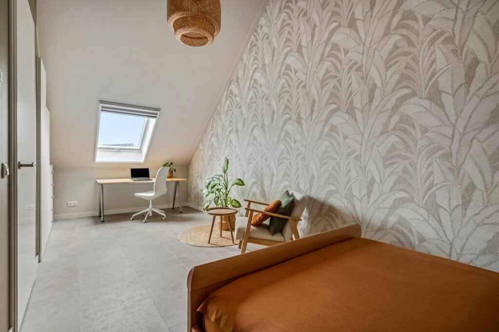 Verder een volwaardige slaapkamer met dakraam met screen. Ook deze verdieping is volledig afgewerkt met PVC vloeren (tegels betonlook) inclusief elektrische vloerverwarming te bedienen met wifi. Dankzij de hoge nok voelt deze verdieping extra ruim aan en biedt het volop mogelijkheden.