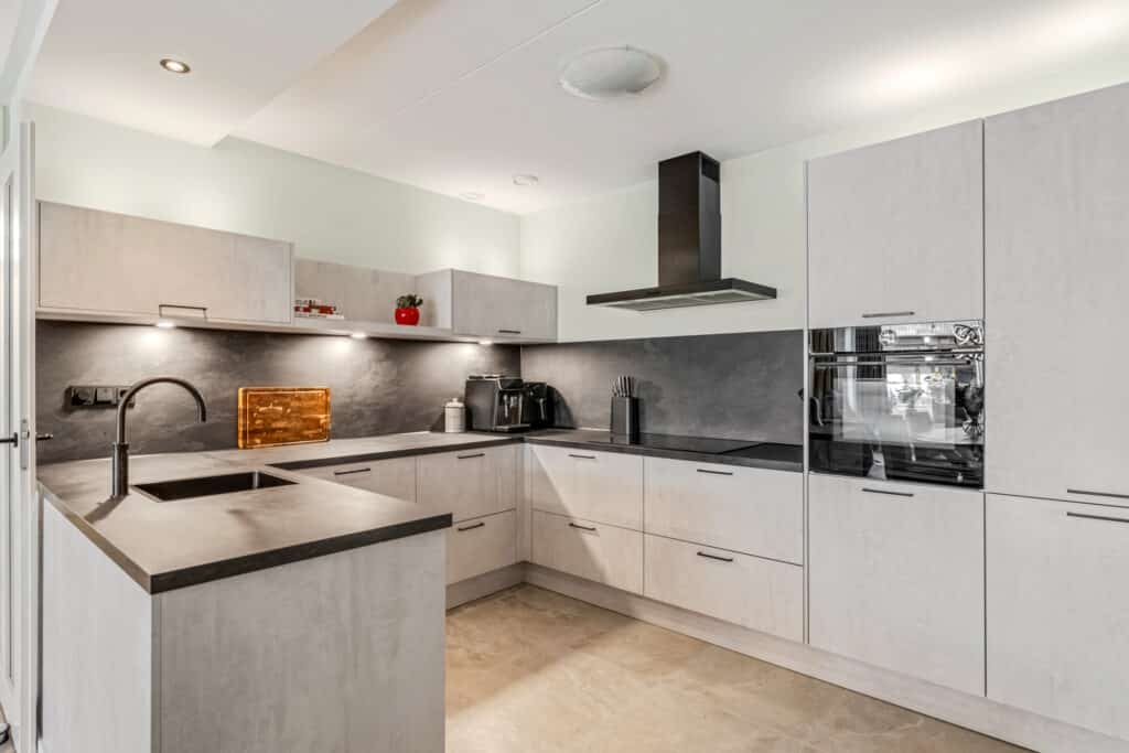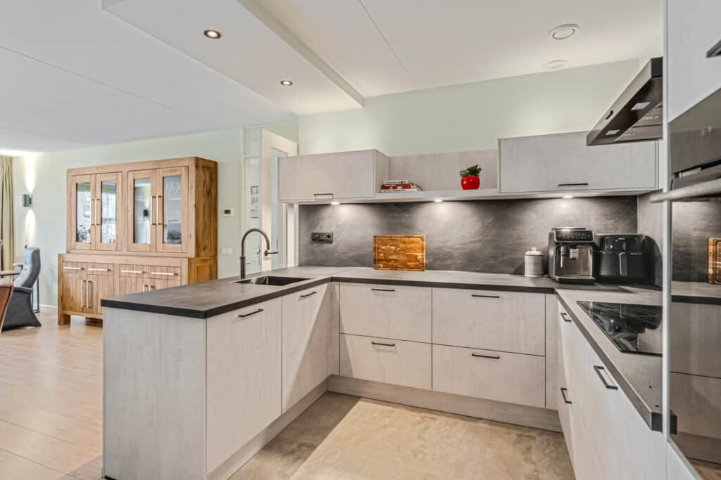 Wanneer u de keuken ziet, valt meteen op hoe modern en doordacht deze ruimte is ingericht. De keuken is pas een jaar oud en verkeert daardoor nog in absolute nieuwstaat, mét garantie. Uitgevoerd in een praktische U-opstelling, biedt zij volop werk- en opbergruimte. De combinatie van een stijlvolle tegelvloer, strakke zwarte greepjes en een ingebouwde spoelbak geeft de keuken een eigentijdse en luxe uitstraling.