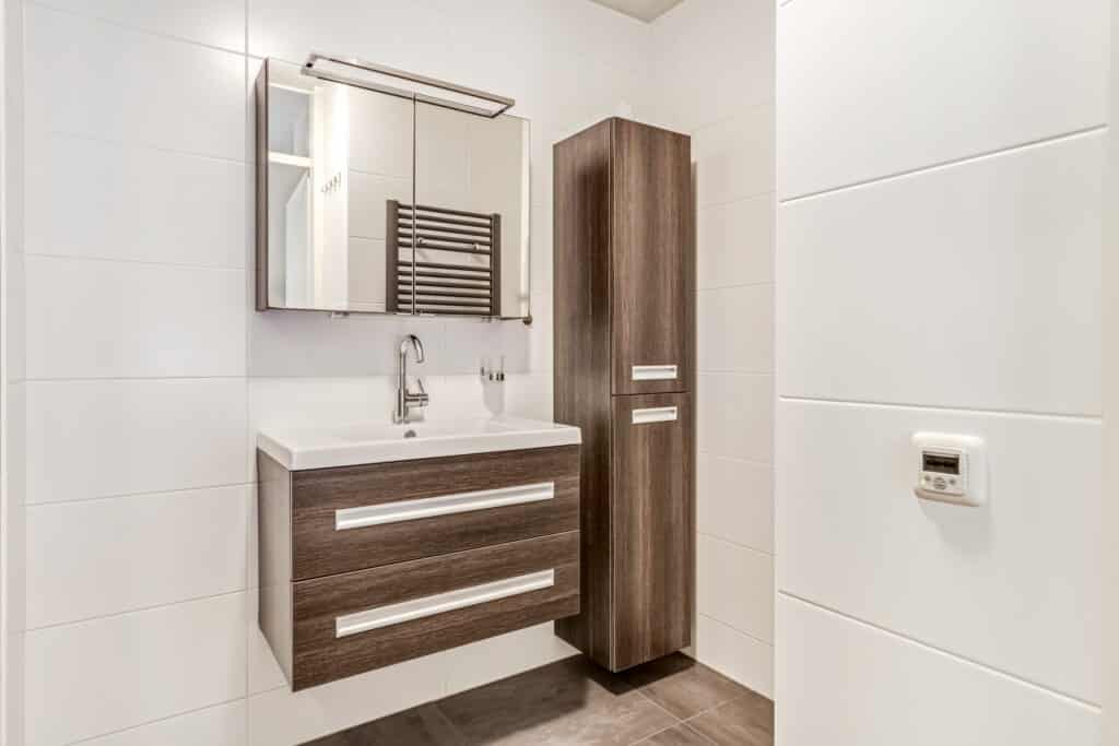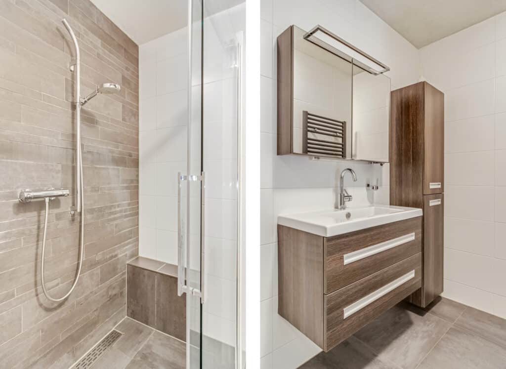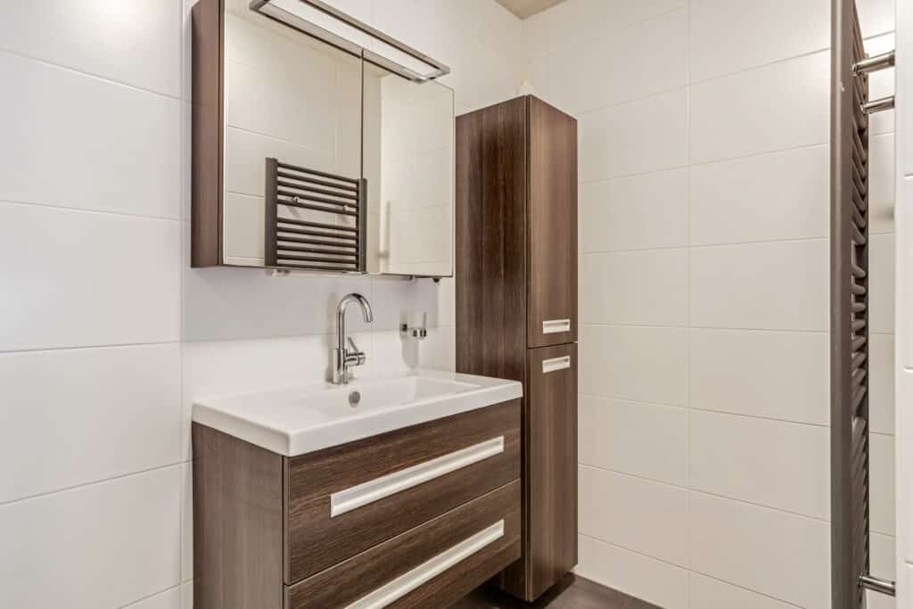 De badkamer is een echte blikvanger. Volledig betegeld met mat witte wandtegels inclusief vloerverwarming en een antracietkleurige vloer, straalt de ruimte een moderne, luxe sfeer uit. De ruime douchecabine met schuifwand biedt extra comfort, en het brede wastafelmeubel is perfect om samen te gebruiken. Een speels detail is het zitje in de douche, afgewerkt met een fraaie mozaïekwand. Hier wordt elke dag beginnen of afsluiten een ontspannen moment.