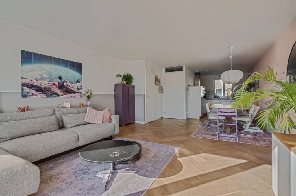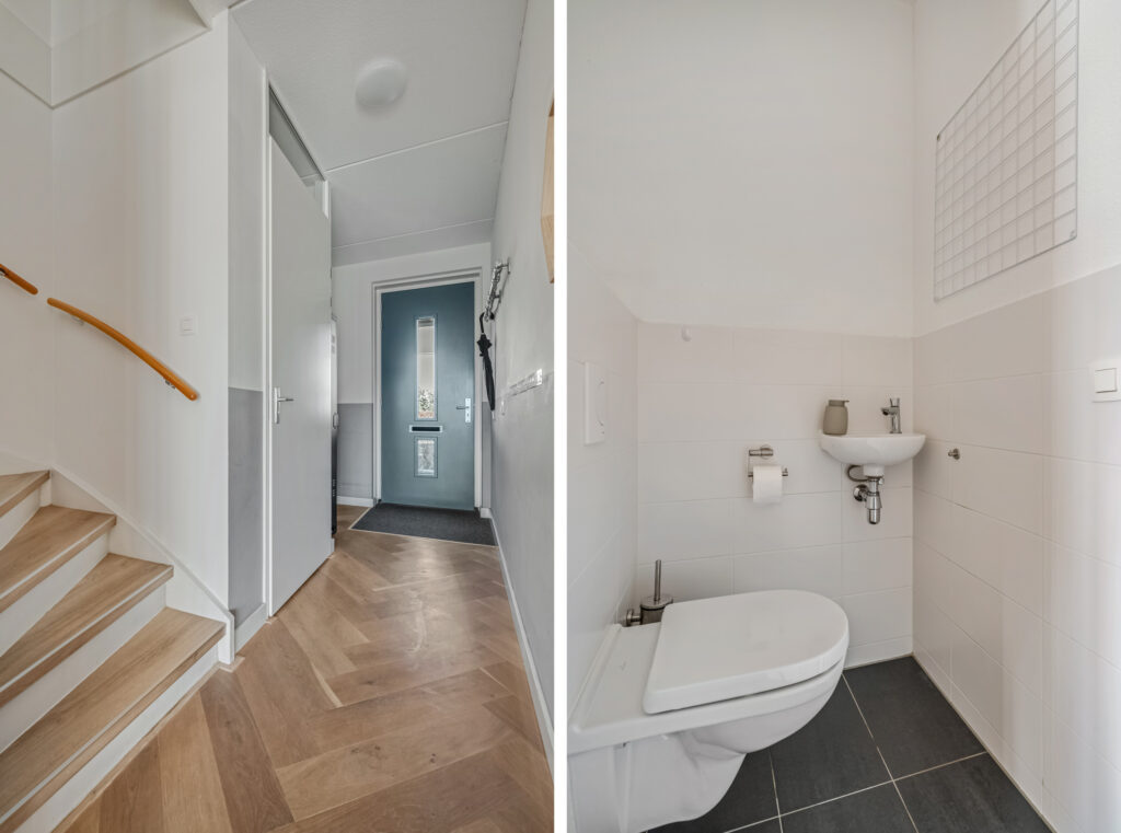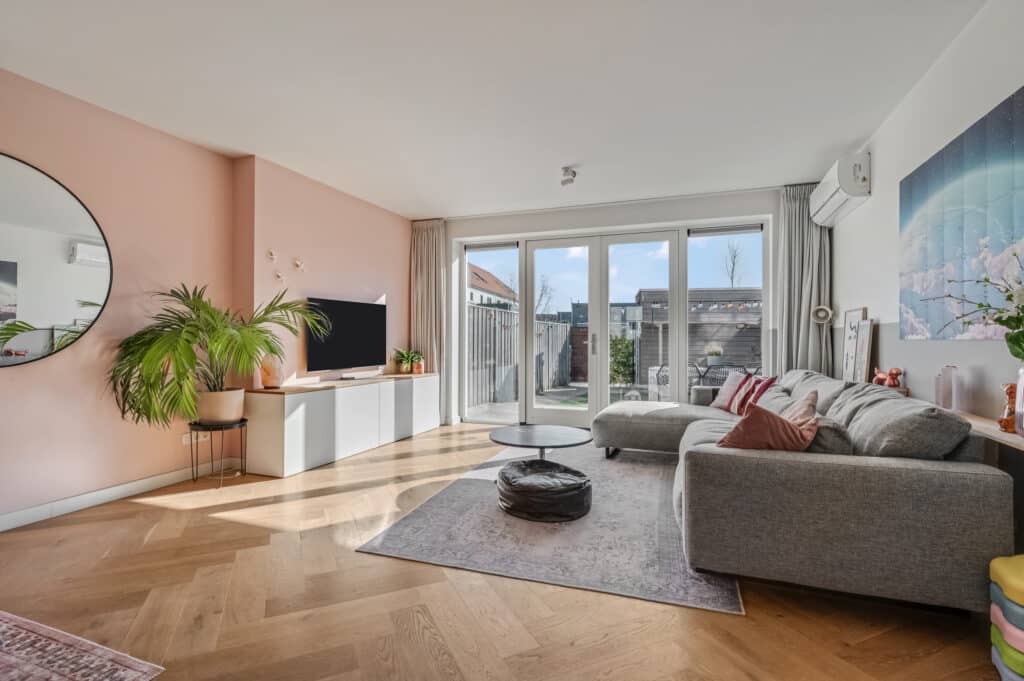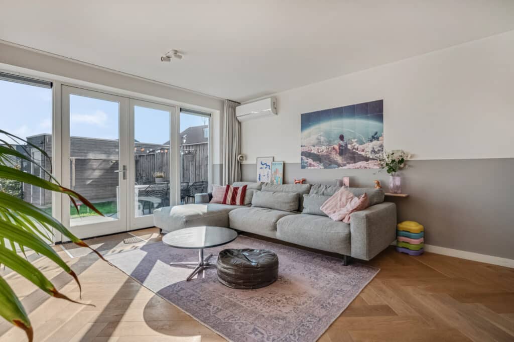 Stap binnen in de ruime hal met moderne meterkast inclusief glasvezel en het strakke moderne toilet met fontein. Je voelt hier ook direct de warme uitstraling van de visgraat houten vloer inclusief vloerverwarming. De woonkamer aan de achterzijde is een echte blikvanger: dankzij de uitbouw en de kamerhoge glazen pui met openslaande deuren stroomt het daglicht binnen en kijk je uit op de zonnige, onderhoudsvriendelijke tuin. Met de airco is het hier het hele jaar door heerlijk comfortabel.