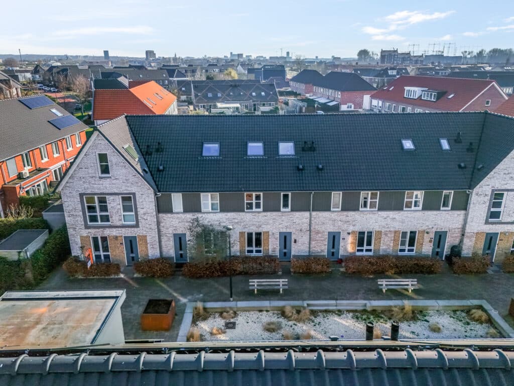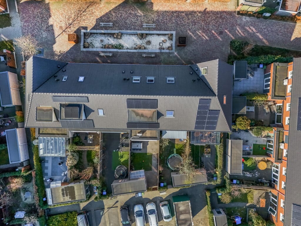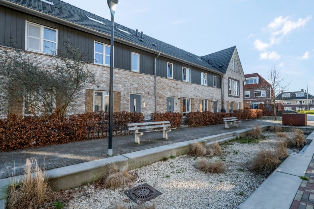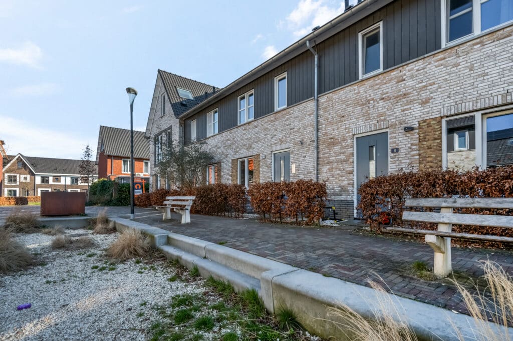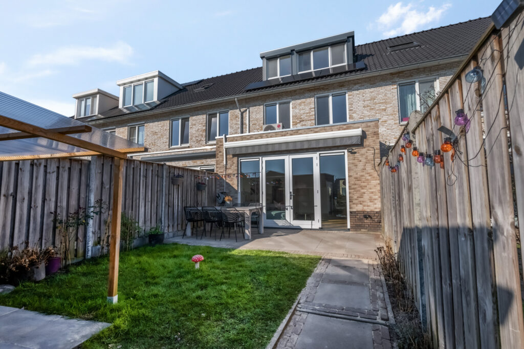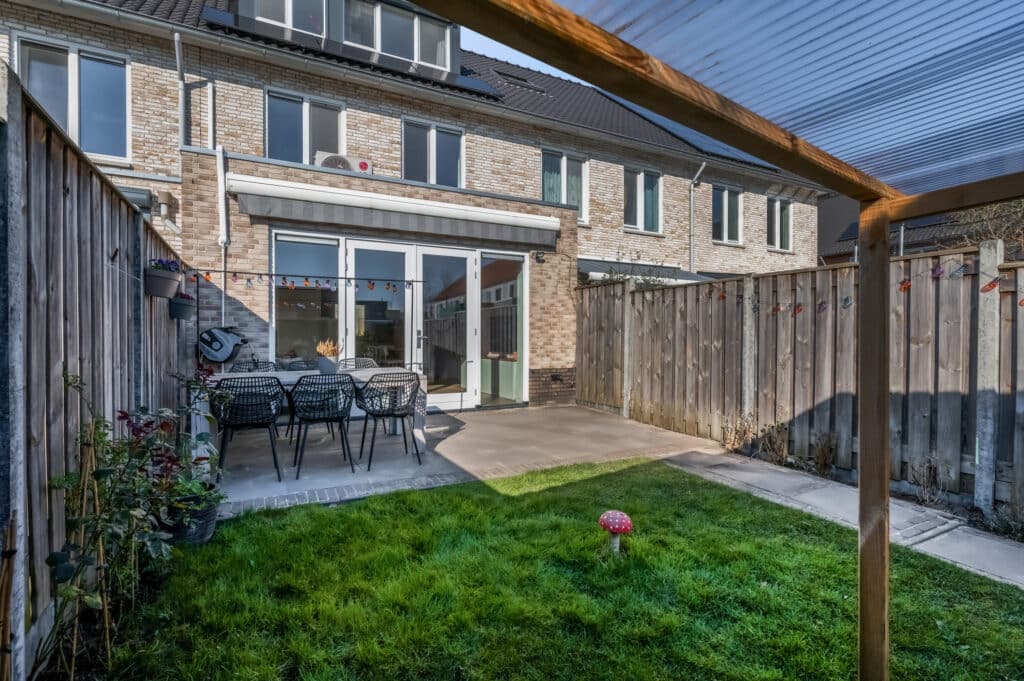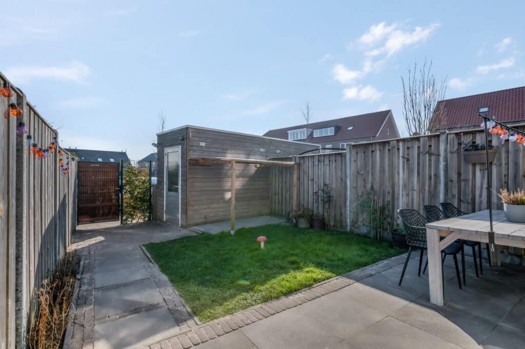 De achtertuin, die is gelegen op het zuiden, is perfect ingedeeld met een terras aan huis, een gazon, een pad naar achter en een houten berging voor fietsen en opslag. Ook is er een handige achterom, die uitkomt op het parkeerterrein achter de woning – ideaal voor bewoners én bezoekers.