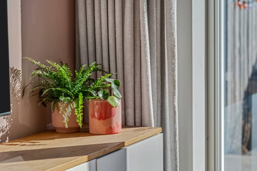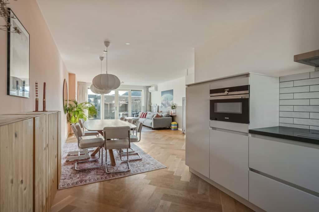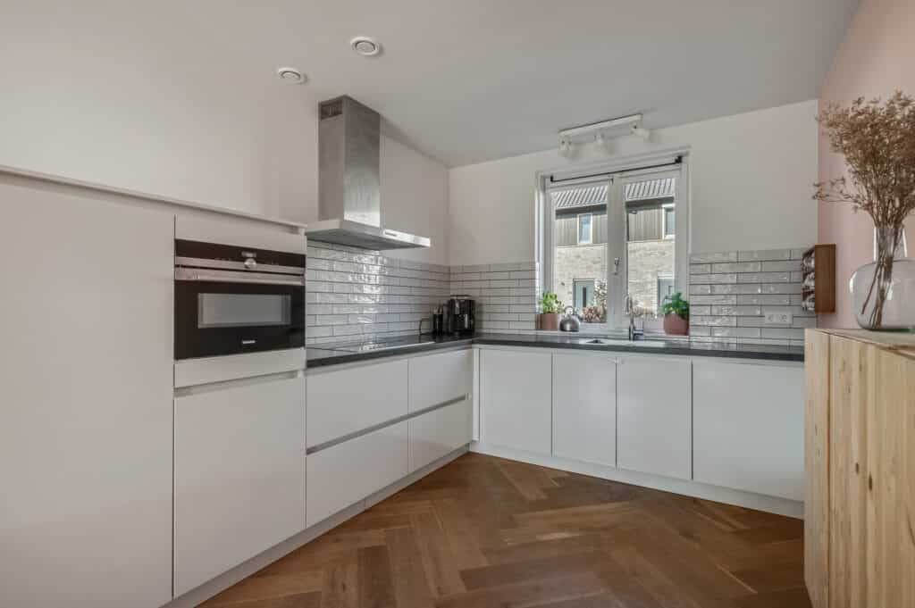 De open keuken aan de voorzijde is een moderne eyecatcher: een L-vormige wit hoogglans keuken zonder grepen, voorzien van een 5-pits inductie kookplaat, Siemens combi oven, brede lades met soft close en een composieten werkblad. De handgewelfde wandtegel en het licht dat door de grote ramen naar binnen stroomt, maken koken hier een genot.
