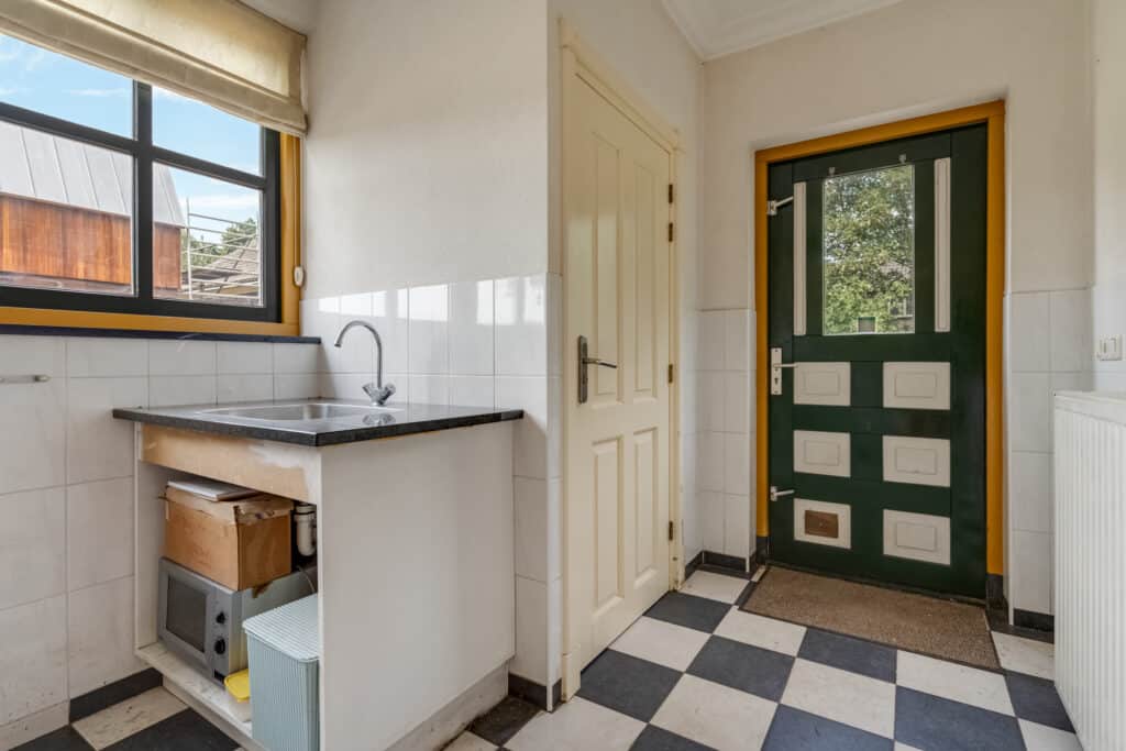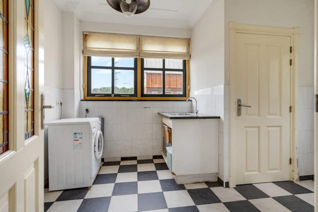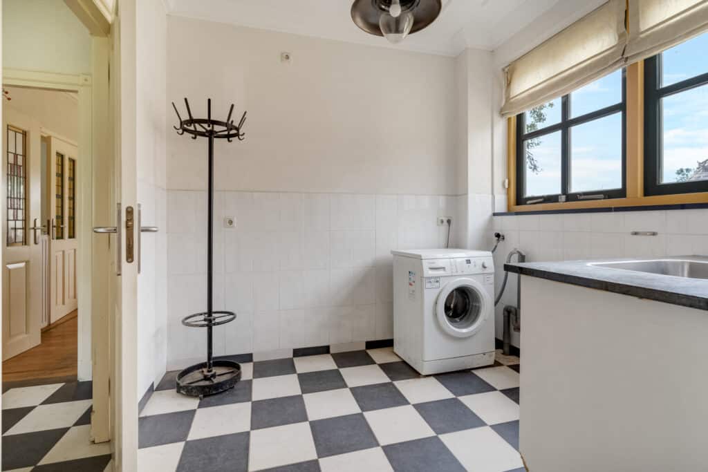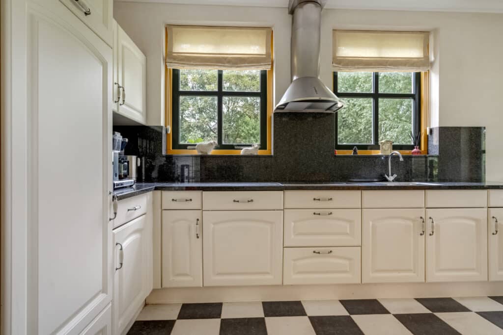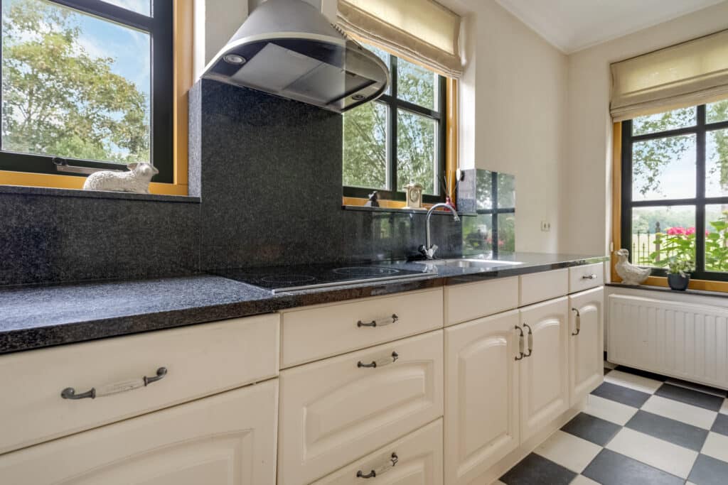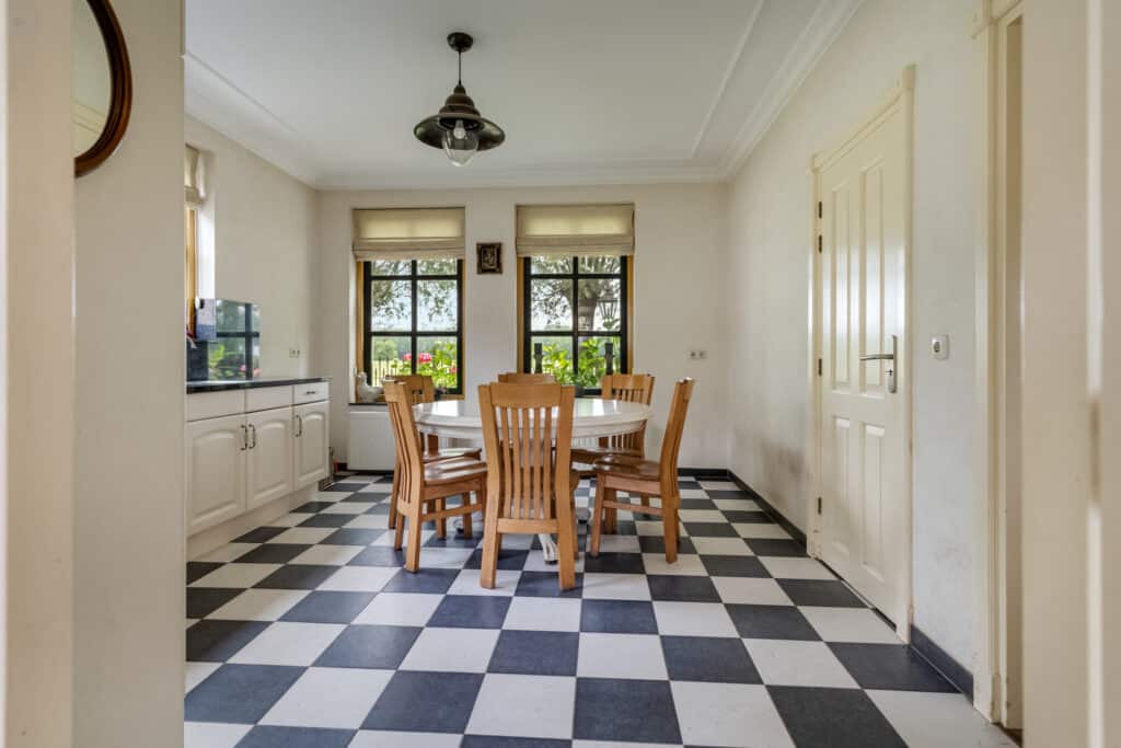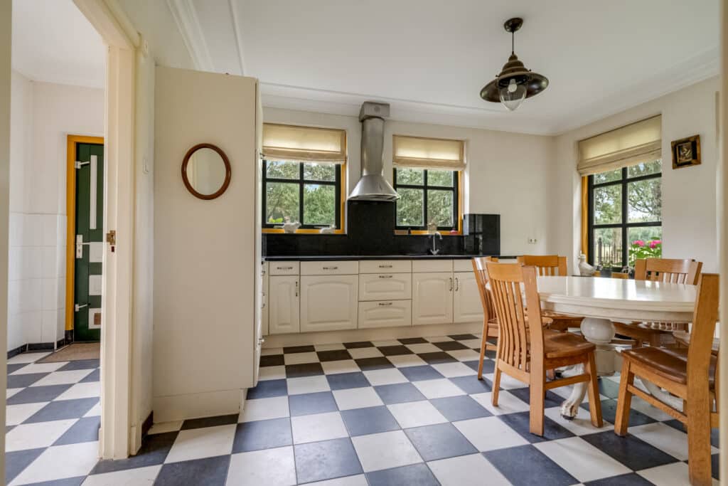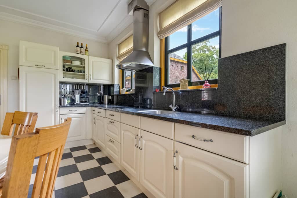 Vanaf de ruime inrit, die voldoende parkeergelegenheid biedt, betreedt u deze woning via de bijkeuken, waar praktische voorzieningen zoals aansluitingen voor wasmachine en droger en een separaat toilet aanwezig zijn. Vanuit de bijkeuken komt u in de landelijke keuken. Deze royale L-vormige keuken is een waar kookparadijs met moderne apparatuur, zoals een vaatwasser, koelkast en kookplaat. Het donkere stenen aanrechtblad en de neutrale afwerking maken het geheel compleet. Door de vele raampartijen geniet u hier van een overvloed aan daglicht, en is er voldoende ruimte voor een gezellige eettafel waar u kunt ontbijten met uitzicht op de tuin.