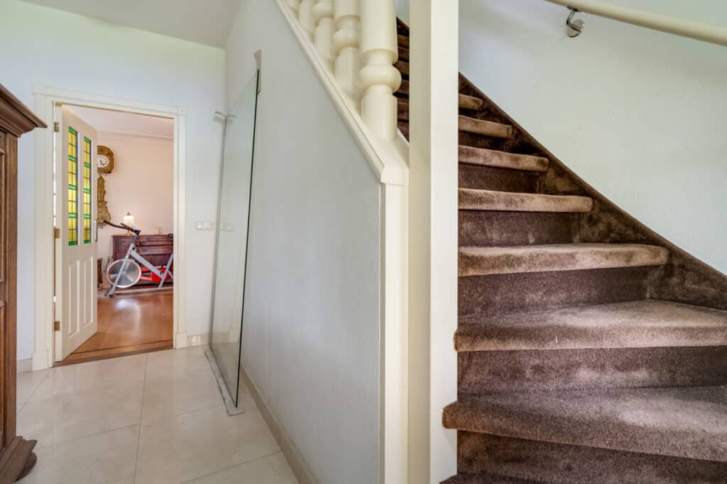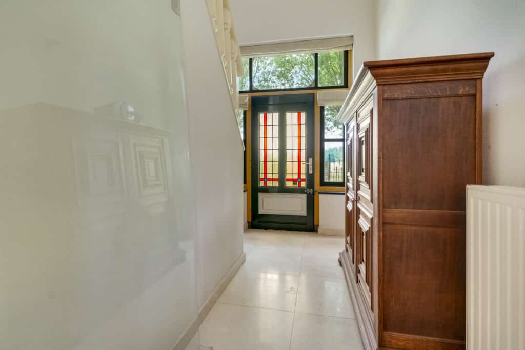 De entree van de woning, die is voorzien van een betegelde vloer, bevindt zich aan de zijkant en leidt naar een ruime hal met een vaste trap naar de bovenverdieping.