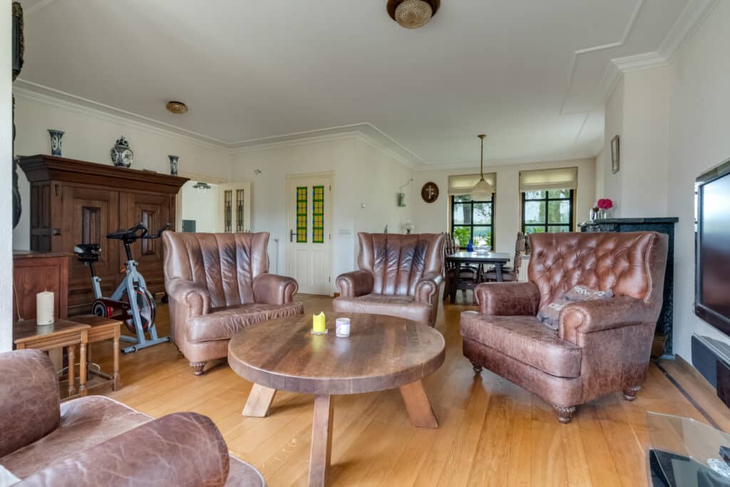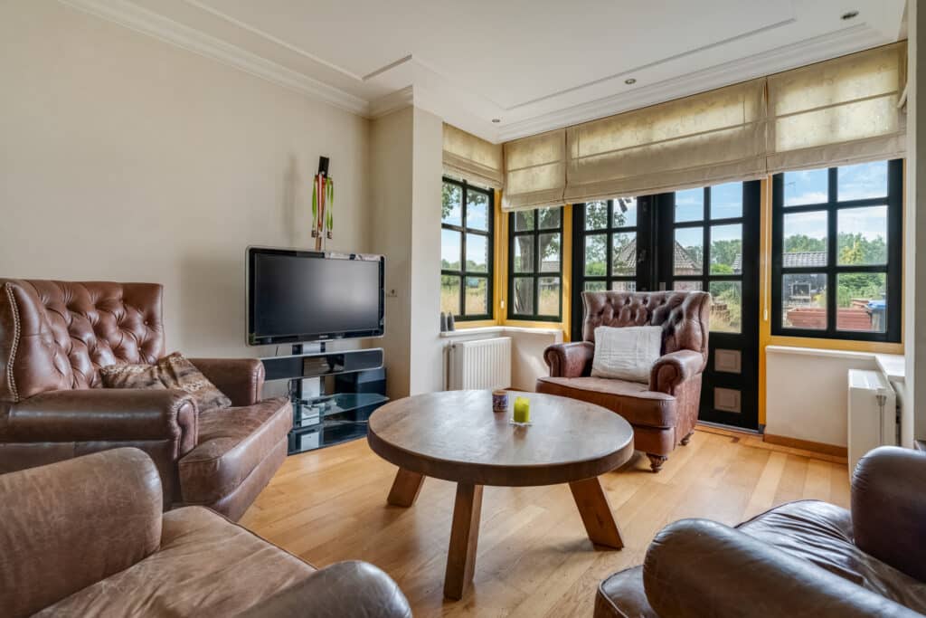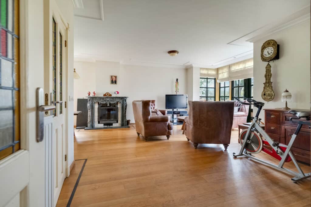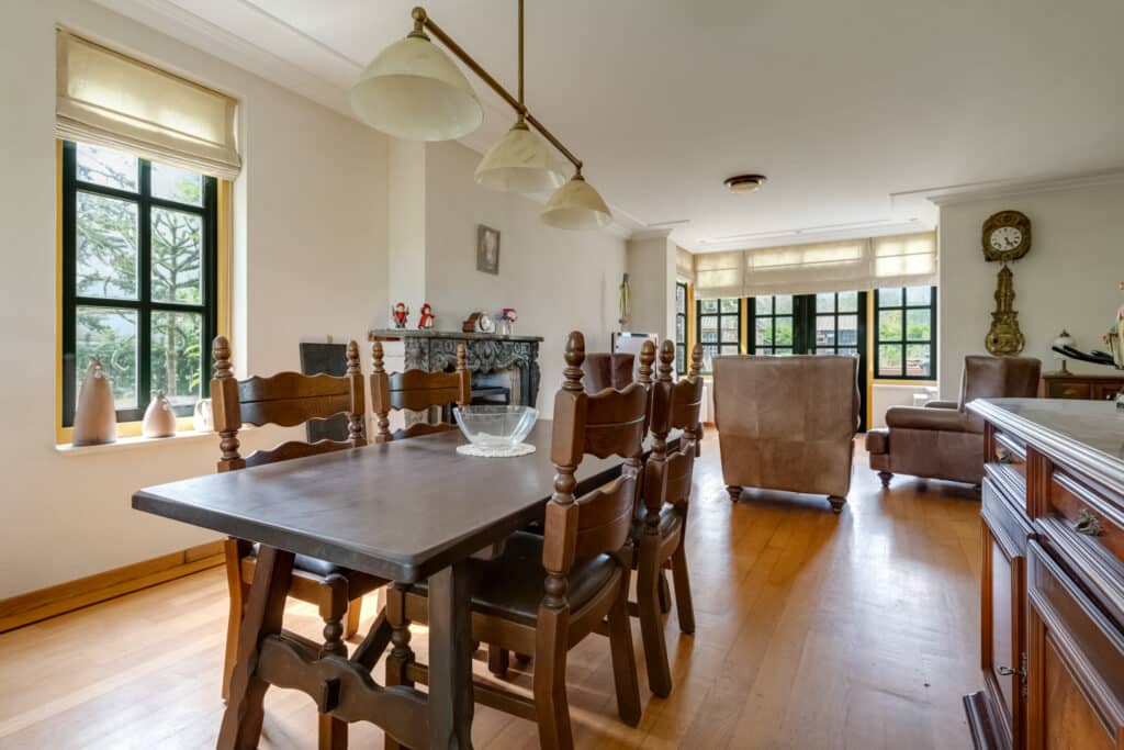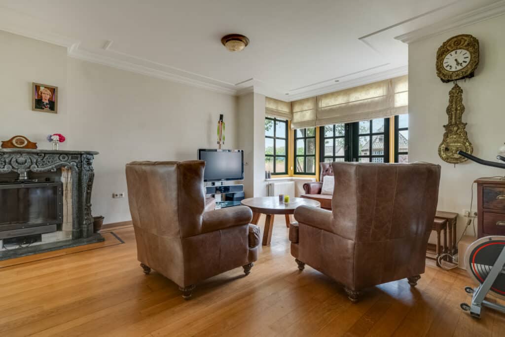 Aansluitend vindt u het ruime woongedeelte, dat door de fantastische erker met raampartijen en de L-vorm een speelse indeling heeft. Hier kunt u naar hartenlust een zit- en eetgedeelte creëren, en is er zelfs nog ruimte voor een werkplek of speelruimte voor de kinderen. De eiken vloer met sierband, de prachtige schouw, en de netjes afgewerkte plafonds en wanden stralen warmte en klasse uit. De erker met ingebouwde spots zorgt voor een sfeervolle verlichting in de avonduren.