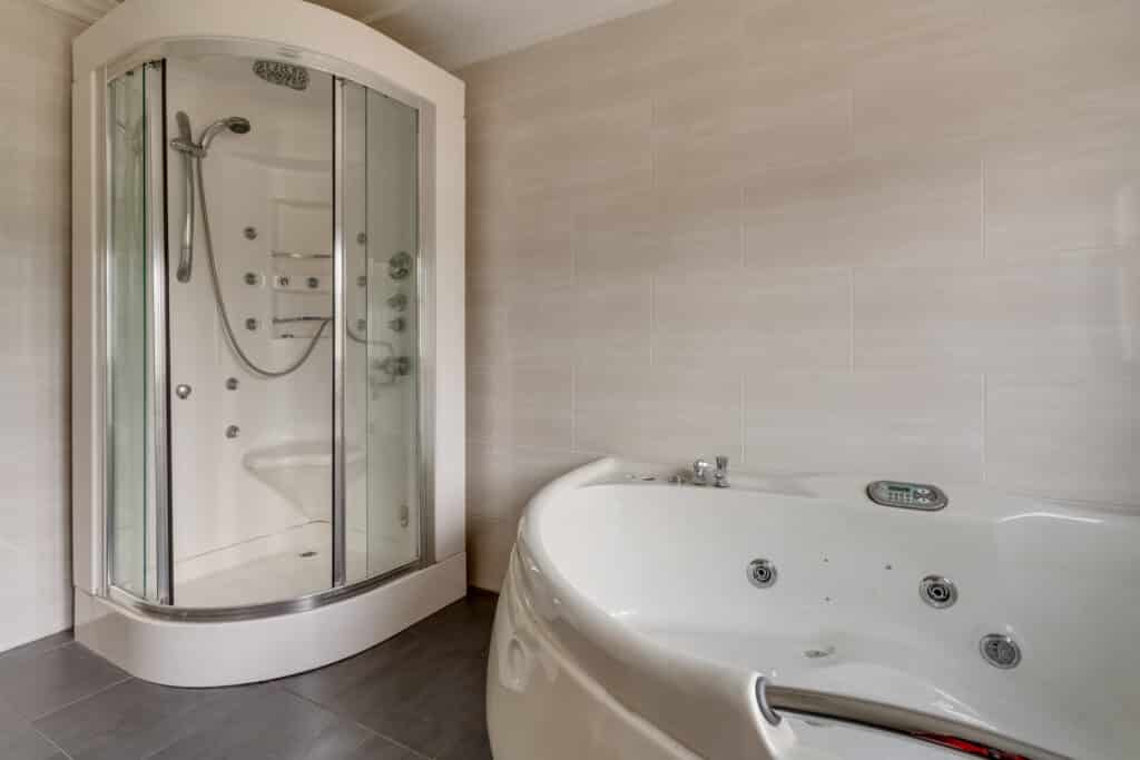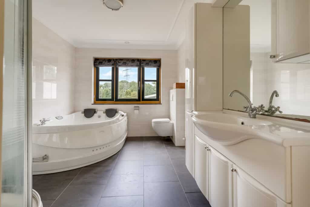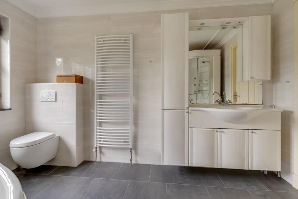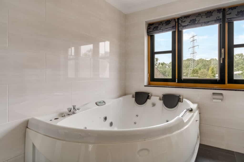 De badkamer is een oase van luxe en comfort. Deze is ruim opgezet en modern afgewerkt, met een breed wasmeubel, een luxe ligbad met bubbels, een douchecabine met zitje en massagefuncties, en een toilet. De badkamer is volledig betegeld in neutrale kleuren en biedt alles wat u nodig heeft voor een ontspannen moment voor uzelf.