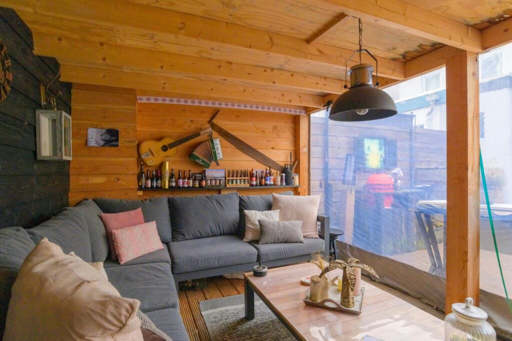 met een lounge hoek, schouw met elektrische haard en televisie. Hier zult u uiteraard uw eigen draai aan moeten geven. Via de overkapping is de houten berging bereikbaar. Zo blijft u altijd droog wanneer u uw gasten van een drankje