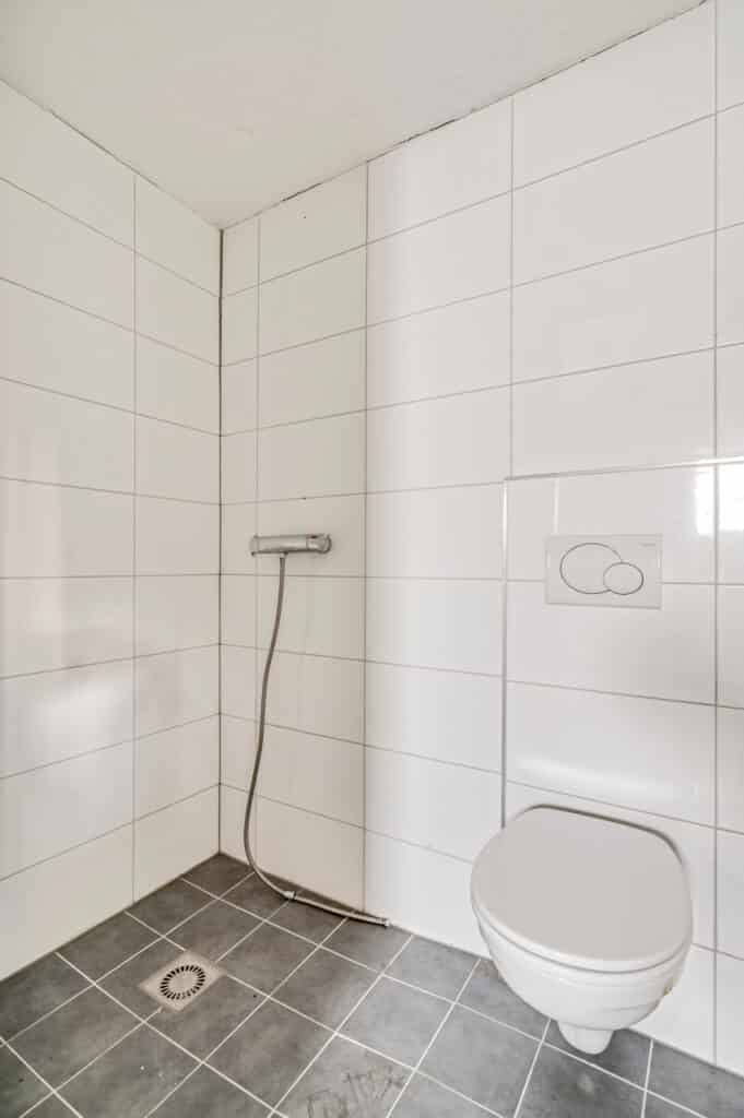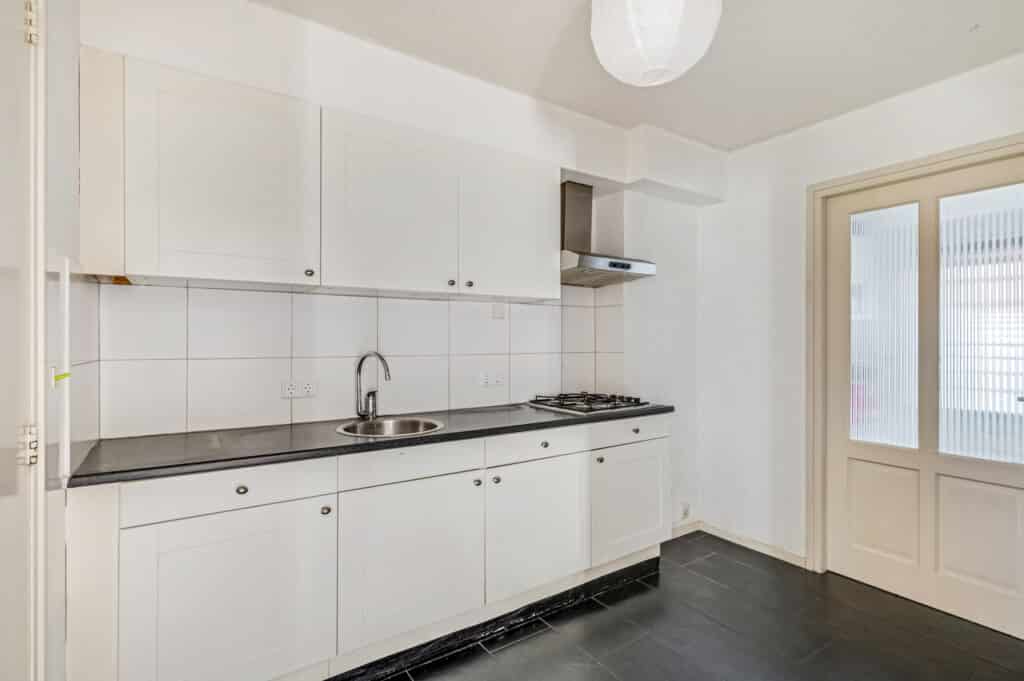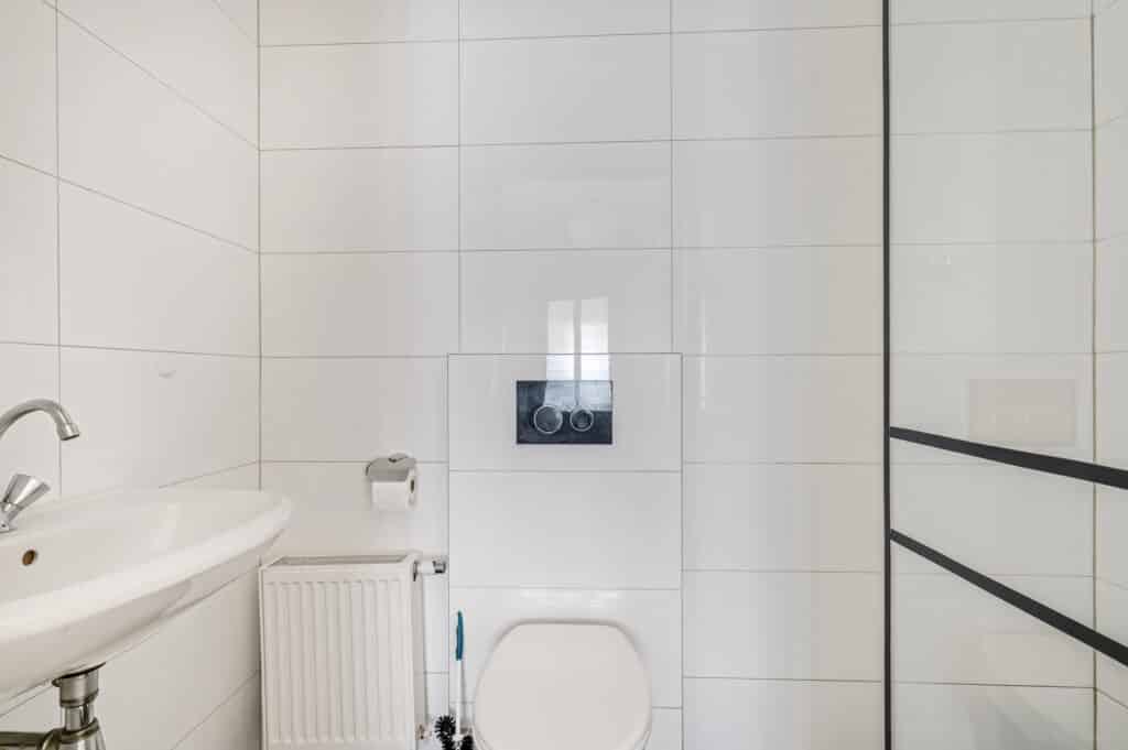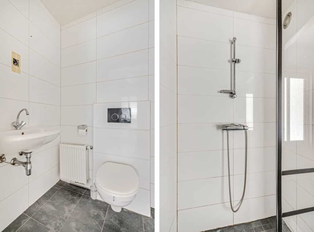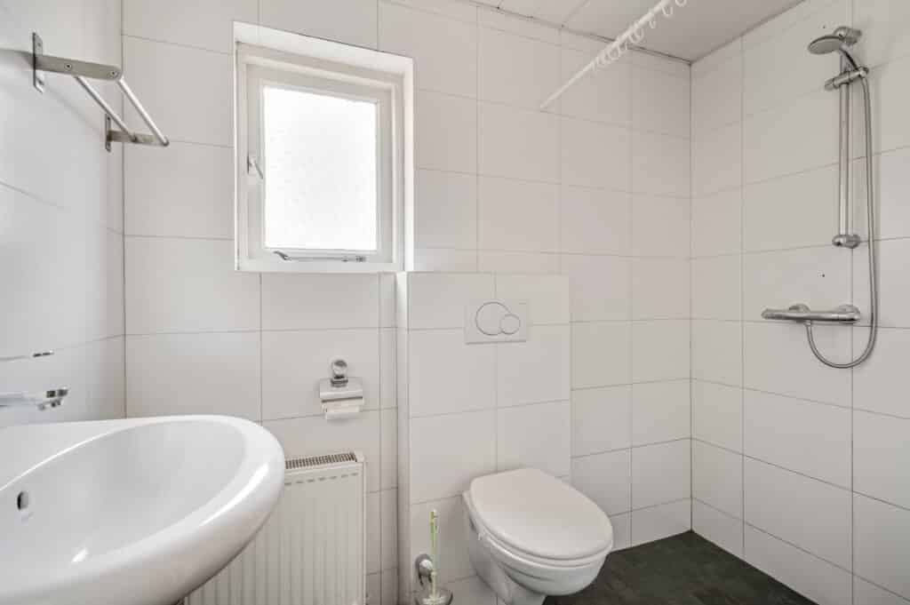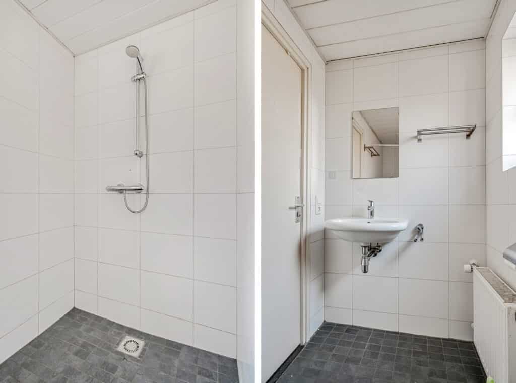 De keuken vormt de schakel tussen de verschillende leefruimtes en beschikt over twee deuren naar het woongedeelte. De linker deur leidt naar de grote uitbouw aan de achterzijde van de woning. De keuken is voorzien van een kunststof werkblad, wit kastwerk, spoelbak en 4-pits gasfornuis met afzuigkap. Zeer handig is de aangesloten badkamer die hier is gerealiseerd. Sanitaire ruimte op de begane grond die modern is afgewerkt. Met een combinatie van antraciet en wit tegelwerk en voorzien van toilet en inloopdouche.