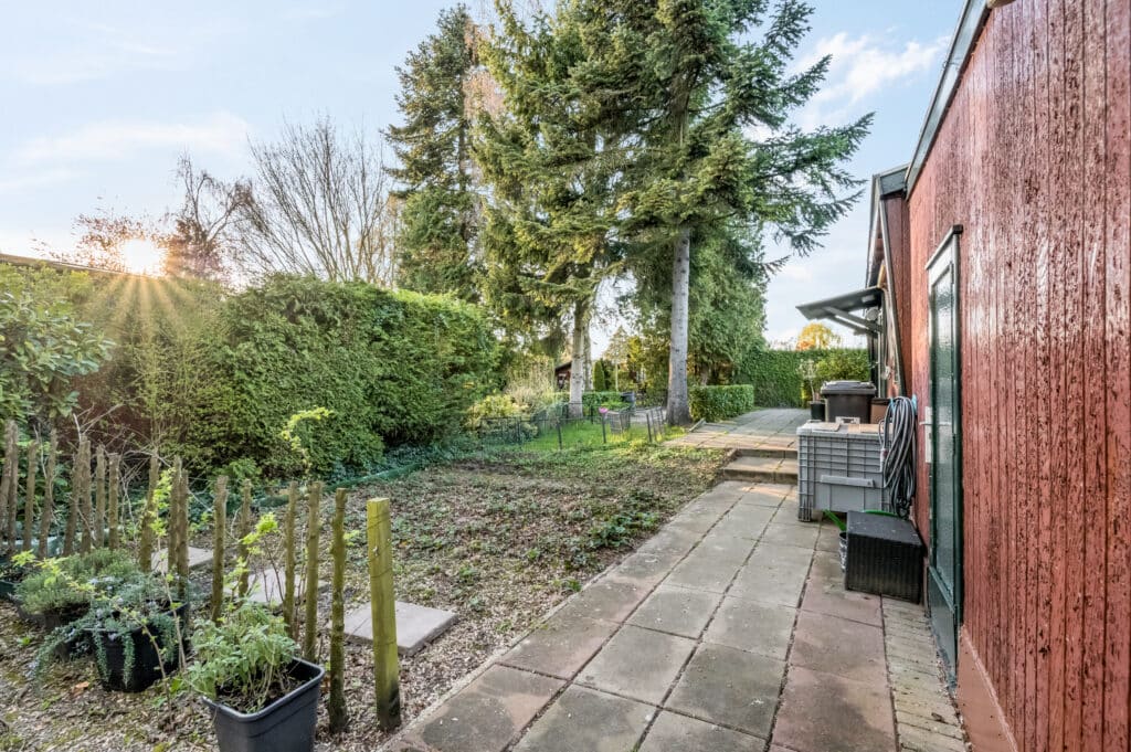 Het perceel biedt ontzettend veel mogelijkheden. Momenteel ingericht met veel groen, bestrating, borders, planten en struiken. Deze ademt het bos en het buitenleven. De tuin biedt vele zonnige plekjes om een terras of loungehoek te realiseren. Door de ligging op het zuiden zijn er veel mogelijkheden om verschillende terrassen en/of plekjes te realiseren waar zowel zon als schaduwmomenten te vinden zijn. Door de ligging van het chalet draait de zon hier de gehele dag in de tuin. Daarnaast is de ligging aan de rand van het park een absolute toevoeging. U kunt hier in alle privacy vertoeven.
