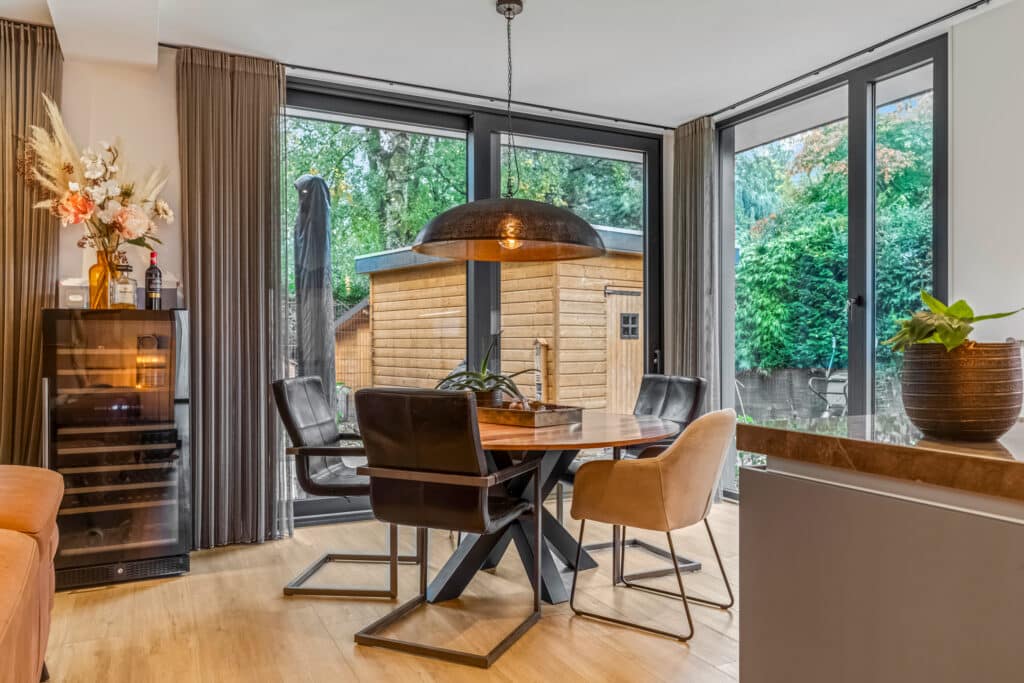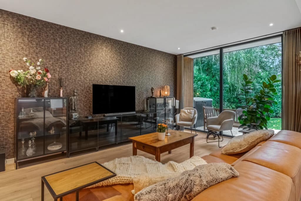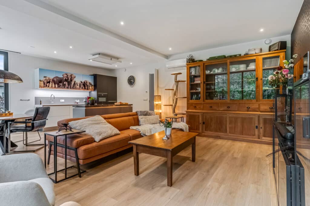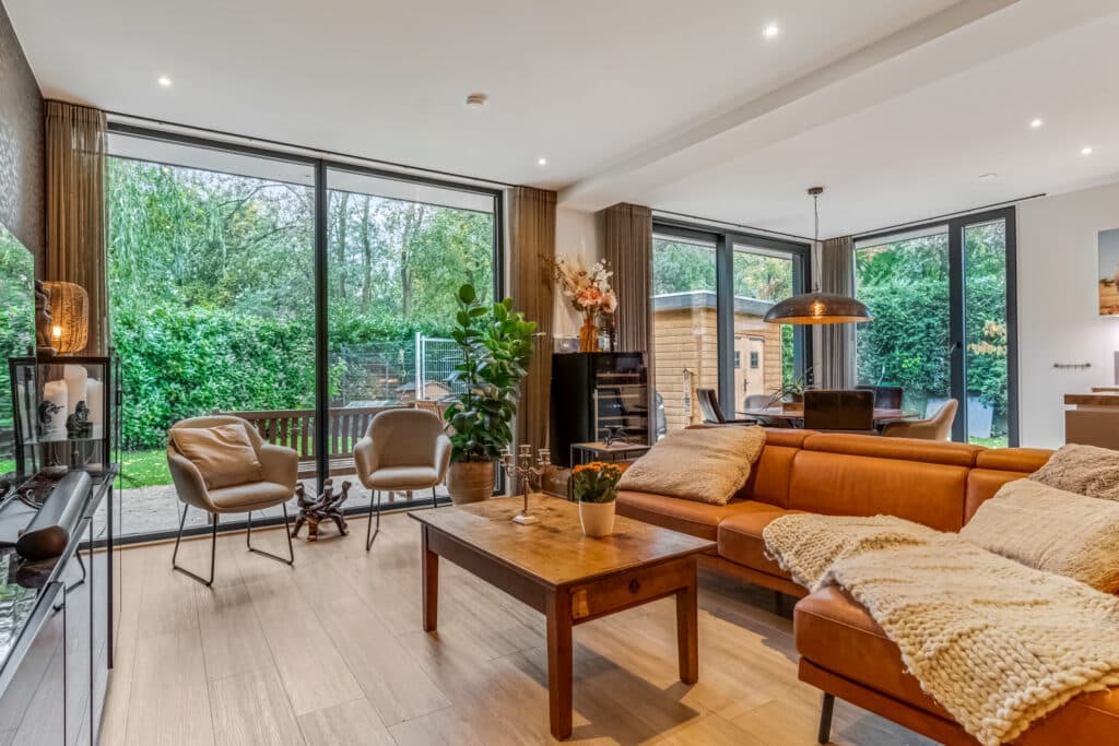 Aan de achterzijde bevindt zich de woonkamer, een ruimte die meteen indruk maakt. Met de hoge plafonds, kamerhoge raampartijen en een schuifpui naar de tuin, is dit een licht, open en ruimtelijk vertrek. Het gevoel van binnen-buiten wonen is hier ongeëvenaard: in één beweging stap je van het gezellige interieur de zonnige tuin in. In de woonkamer is ruimte voor een grote zithoek en een eettafel, terwijl de spots en airconditioning zorgen voor een comfortabel en stijlvol verblijf. Dit is de plek waar je samenkomt, ontspant en gasten ontvangt – een hart van het huis dat luxe en warmte combineert.