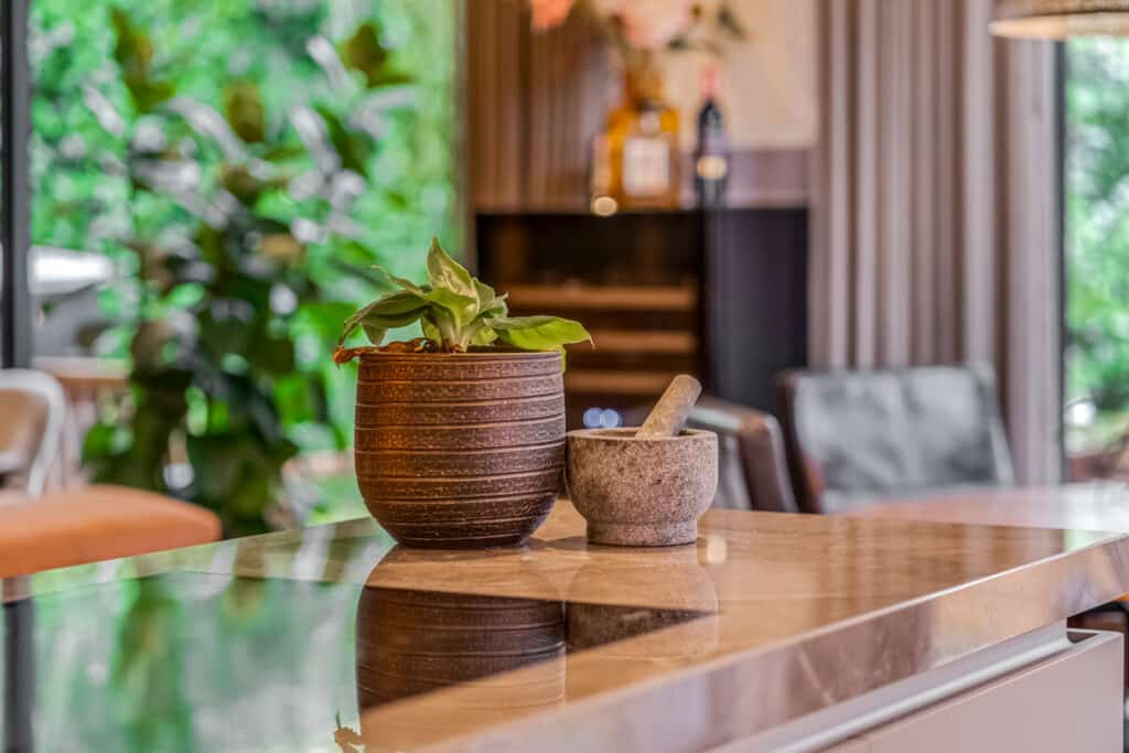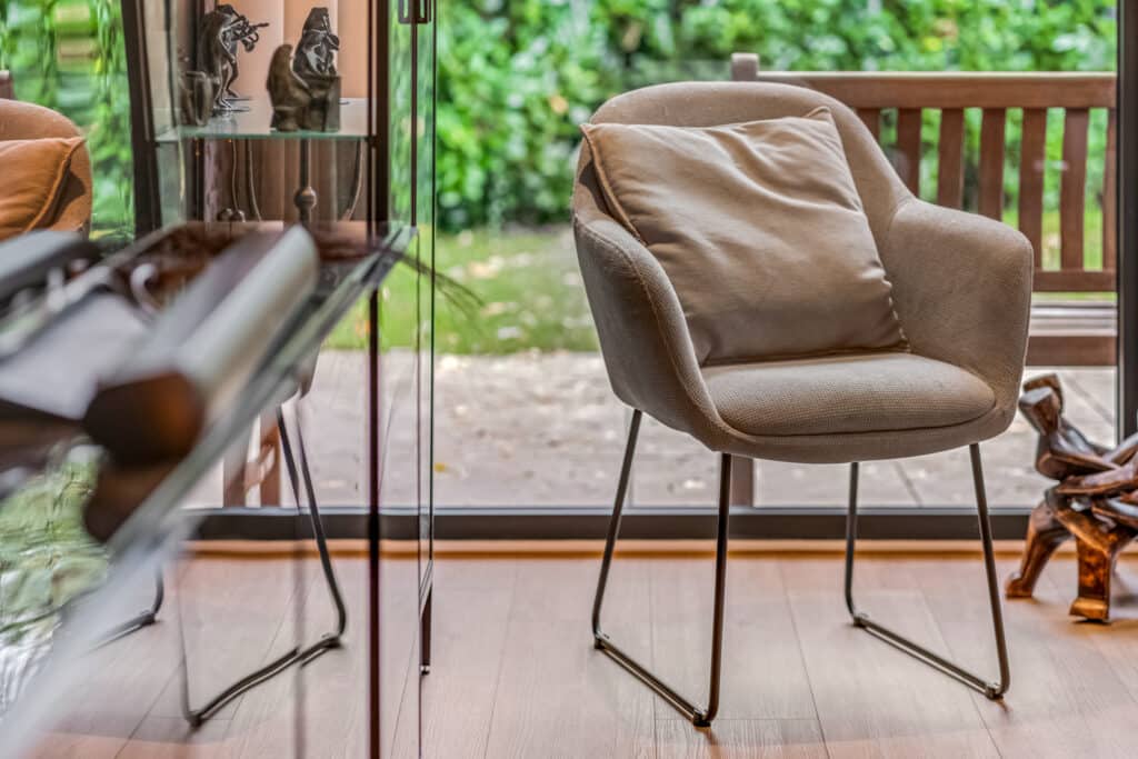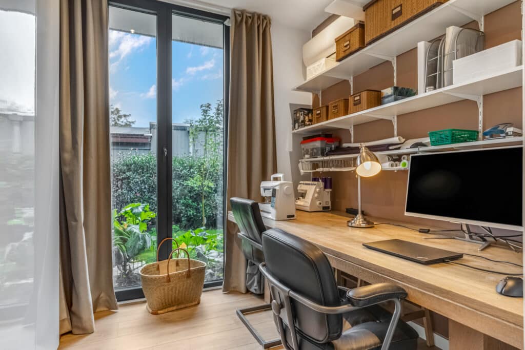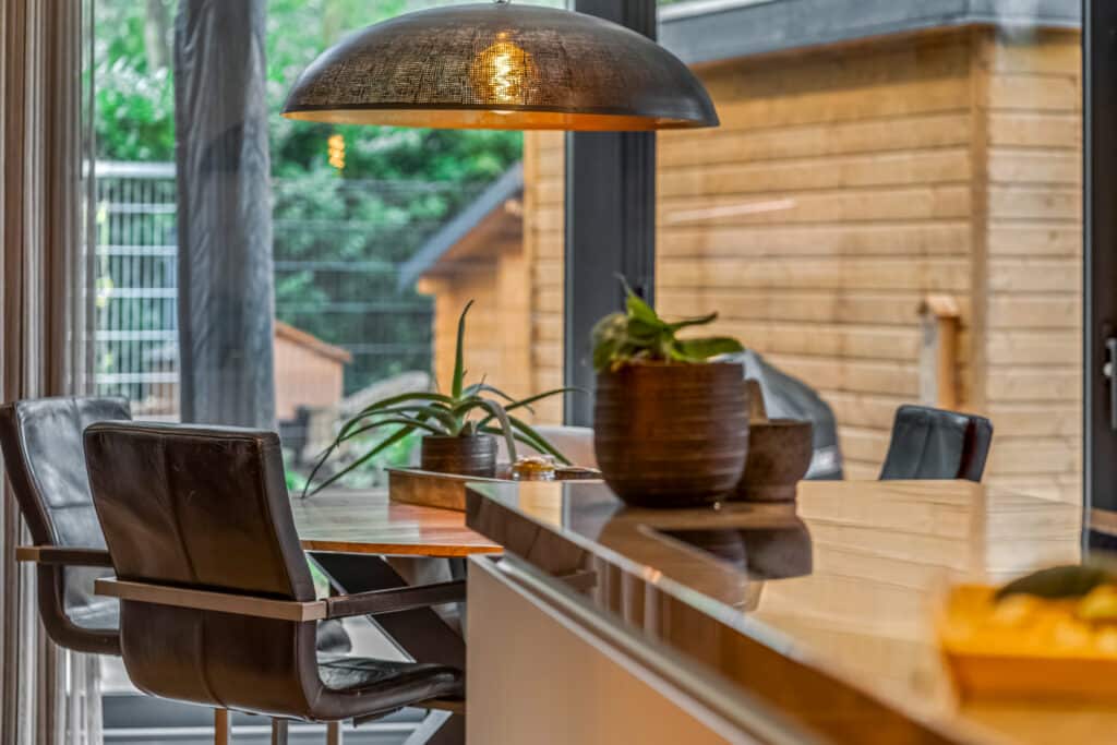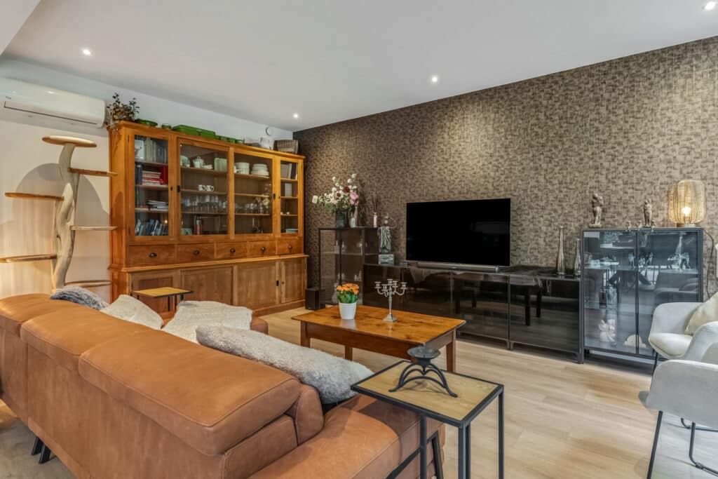 Aan de achterzijde bevindt zich de woonkamer, een ruimte die meteen indruk maakt. Met de hoge plafonds, kamerhoge raampartijen en een schuifpui naar de tuin, is dit een licht, open en ruimtelijk vertrek. Het gevoel van binnen-buiten wonen is hier ongeëvenaard: in één beweging stap je van het gezellige interieur de zonnige tuin in. In de woonkamer is ruimte voor een grote zithoek en een eettafel, terwijl de spots en airconditioning zorgen voor een comfortabel en stijlvol verblijf. Dit is de plek waar je samenkomt, ontspant en gasten ontvangt – een hart van het huis dat luxe en warmte combineert.
