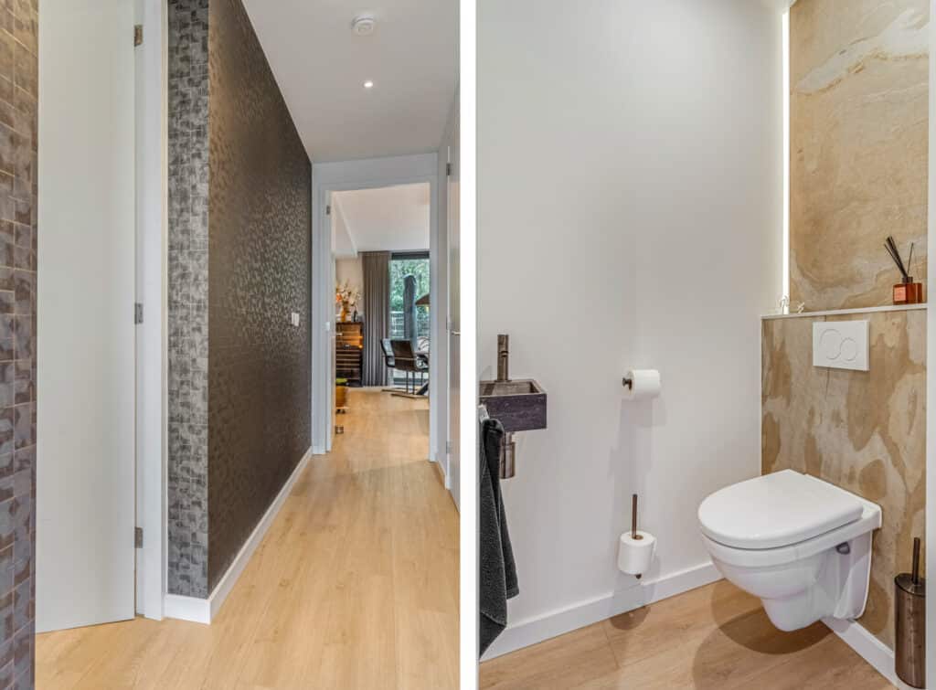Aan de hal grenst de technische ruimte, waar de wasmachine en droger, de WTW-unit, de grote warmwaterboiler, uitstekende waterontharder en een moderne meterkast stijlvol zijn weggewerkt. Hier merk je meteen dat alles in deze woning niet alleen mooi is, maar ook uiterst praktisch. Het separate moderne toilet met fontein sluit hier naadloos bij aan en zorgt voor een stijlvolle, schone eerste indruk.