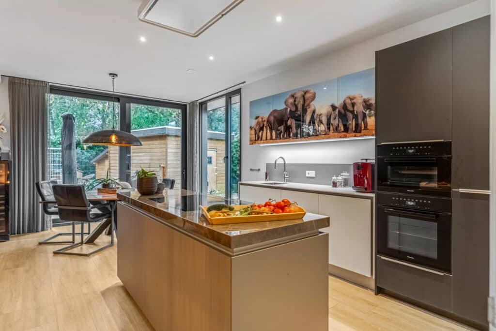 De keuken is een absolute eyecatcher. Het kookeiland vormt het middelpunt en nodigt uit om te koken, te borrelen of gewoon samen te zijn. De keuken is voorzien van topapparatuur van Miele: een inductiekookplaat, stoomoven, reguliere oven, koel-vriescombinatie, vaatwasser, Quooker en circulatie-afzuigkap.