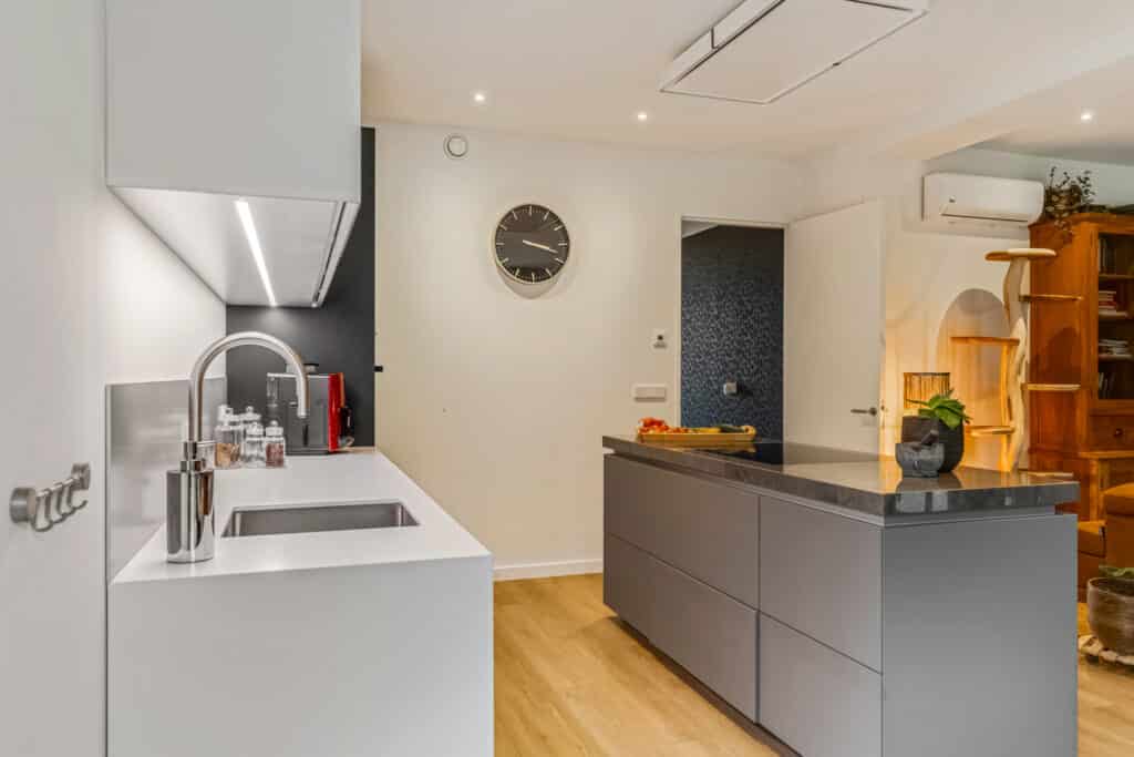 De combinatie van kleuren, de soft-close lades en de ingebouwde spoelbak zorgen dat functionaliteit en esthetiek naadloos samenkomen. Hier kook je in stijl, terwijl het hele gezin of je gasten meegenieten van het gezellige, open gevoel dat de keuken uitstraalt.