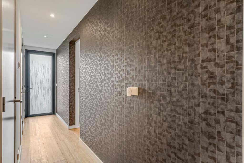 Bij binnenkomst stap je een lange, lichte hal binnen die meteen de toon zet voor de rest van de woning. Overal ligt een lichte pvc-vloer met hoge plinten, de wanden en plafonds zijn strak en glad afgewerkt. In de hal zijn dimbare inbouwspots geplaatst, waardoor je de sfeer volledig naar wens kunt aanpassen – van helder functioneel licht tot warme, intieme verlichting in de avond.
