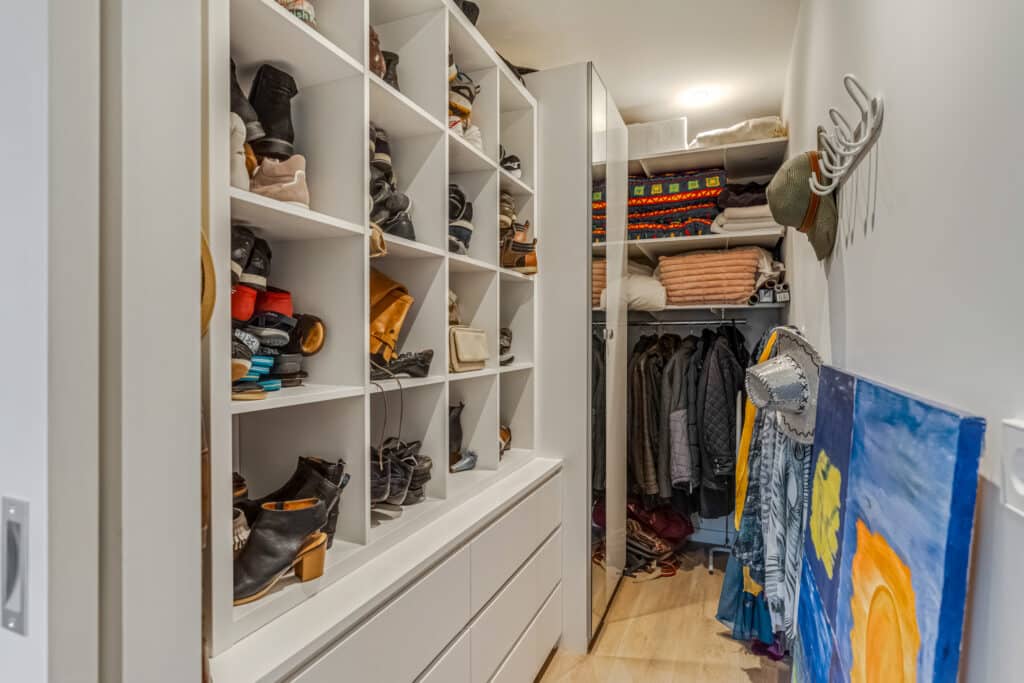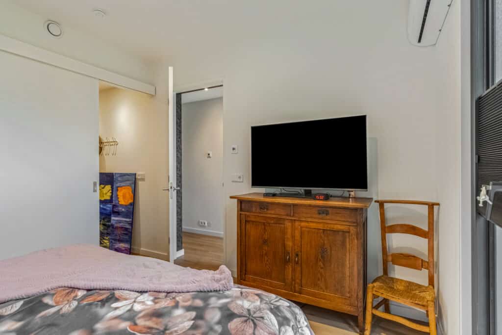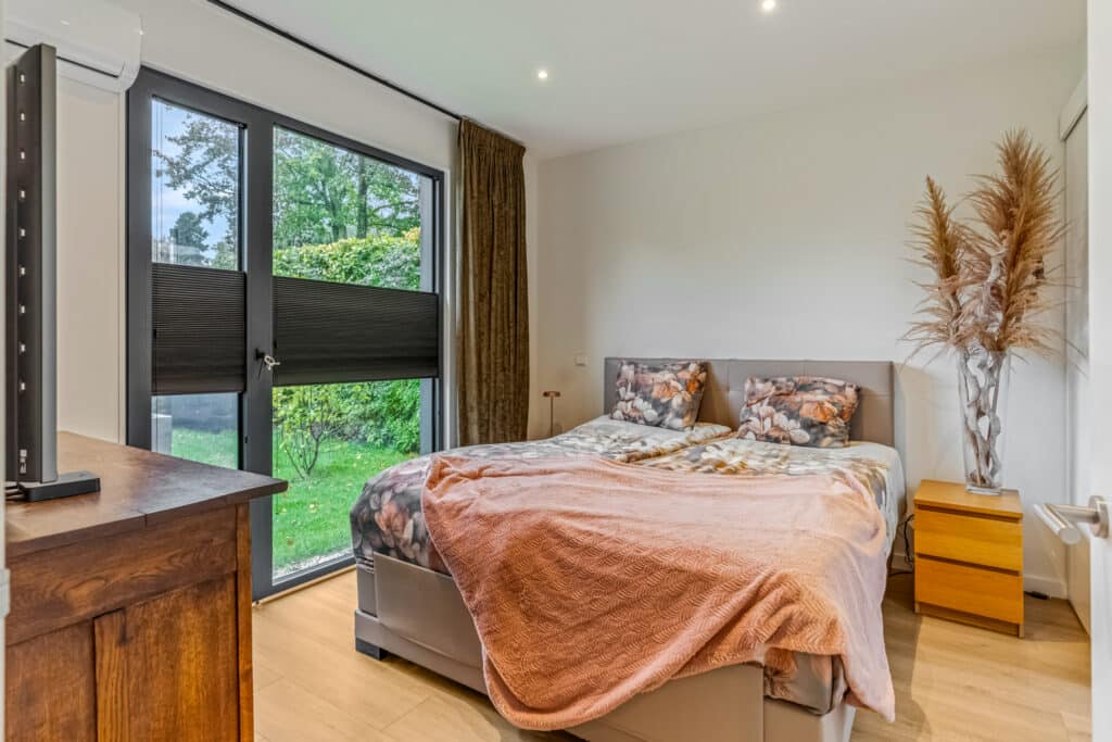 De hoofdslaapkamer aan de voorzijde is een werkelijk royaal vertrek waar je elke ochtend wordt begroet door het zachte daglicht dat door de grote ramen naar binnen valt. Dankzij de airconditioning is er hier het hele jaar door een heerlijk klimaat, en achter de schuifdeur ligt een walk-in closet die eenvoudig afgesloten kan worden – een luxe die praktisch en elegant tegelijk is.