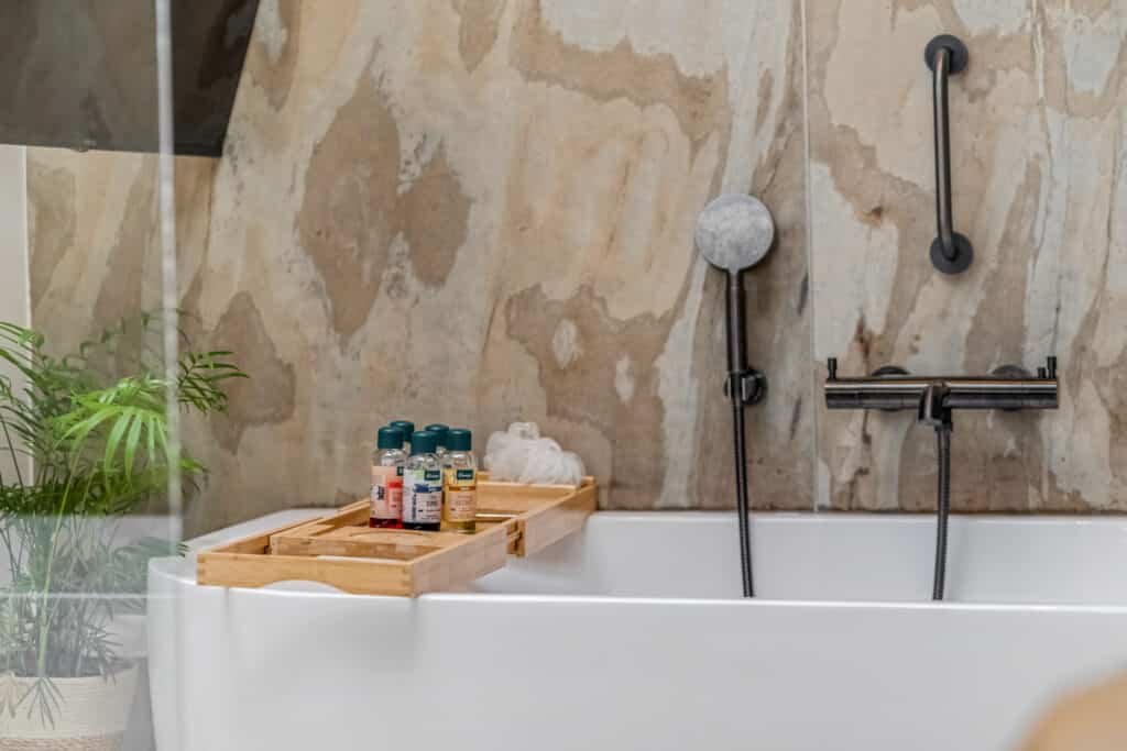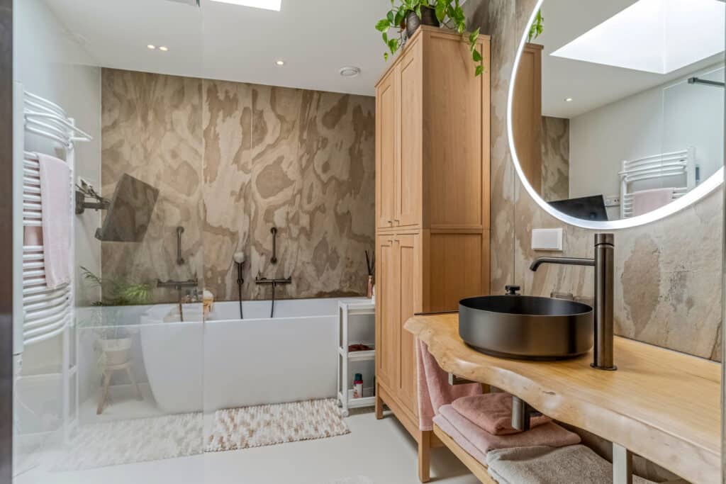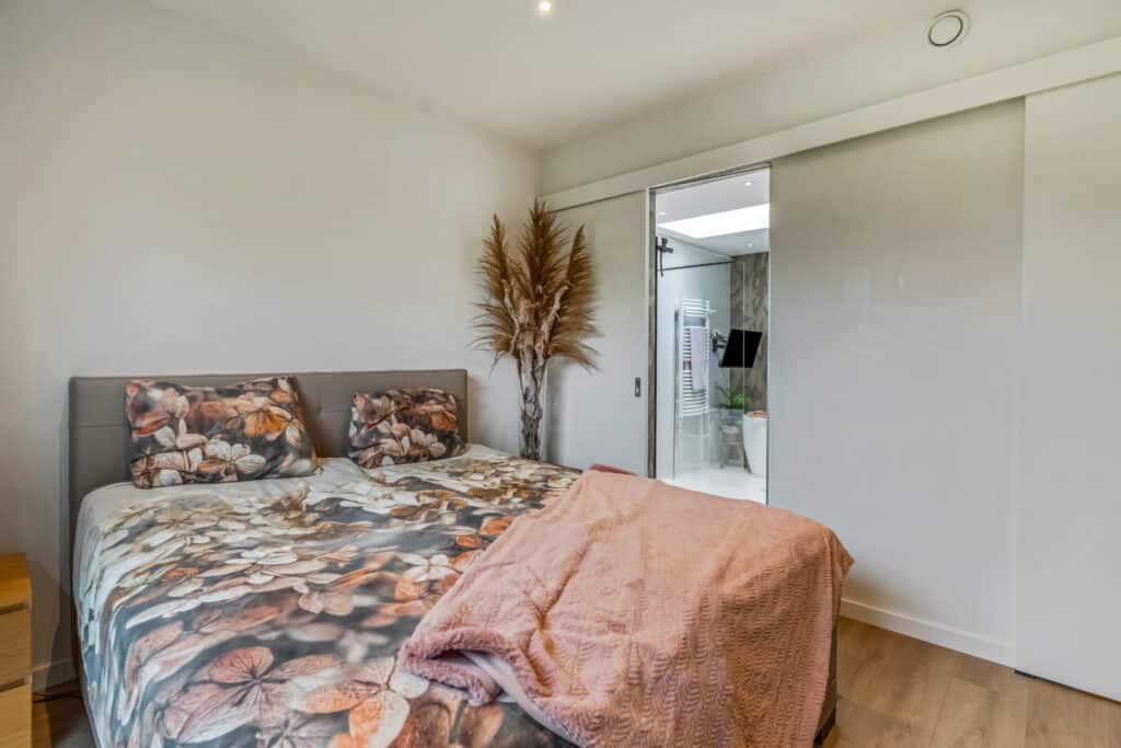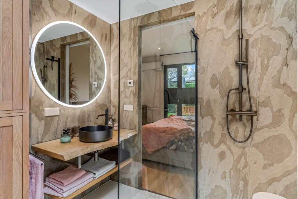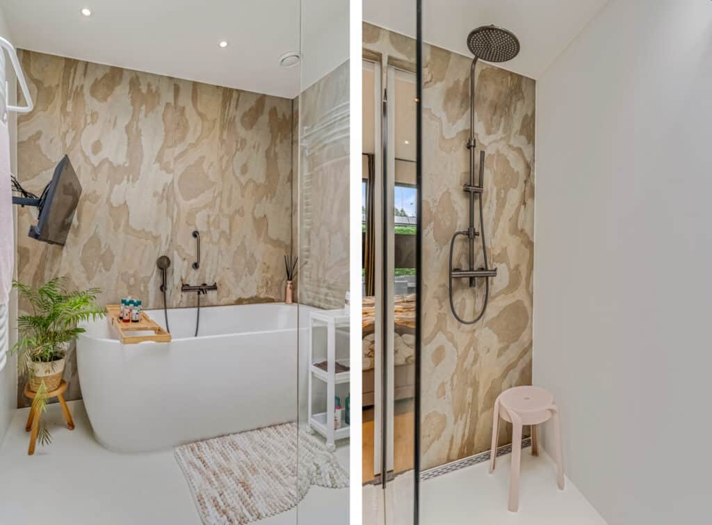 Vanuit de slaapkamer bereik je de en-suite badkamer, een plek die aanvoelt als een privé-wellness. Hier staat een riant ligbad met TV-aansluiting, een grote inloopdouche met regendouche, een wastafel op houten blad met spiegel en een lichte gietvloer die de ruimte een serene uitstraling geeft. De lichtkoepel zorgt voor een prachtige natuurlijke lichtinval en maakt de badkamer een ruimte waar je dagelijks kunt ontspannen, net alsof je in een luxe spa bent.